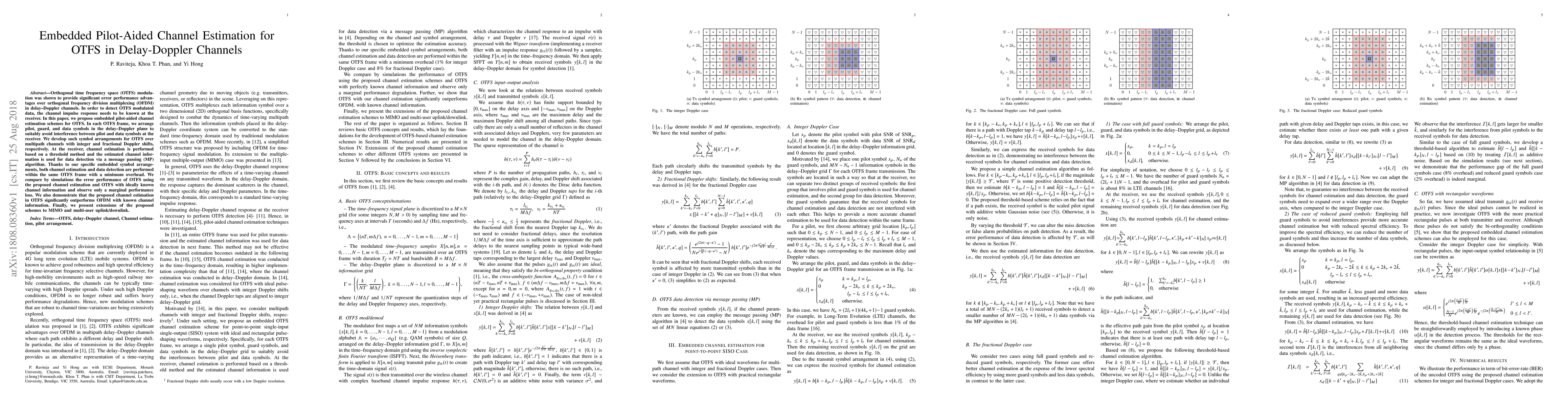 This paper proposes embedded pilot-aided channel estimation for OTFS in delay-Doppler channels, optimizing symbol arrangements to avoid interference and enabling efficient channel estimation and data detection within the same OTFS frame with minimal overhead, showing improved performance over OFDM.