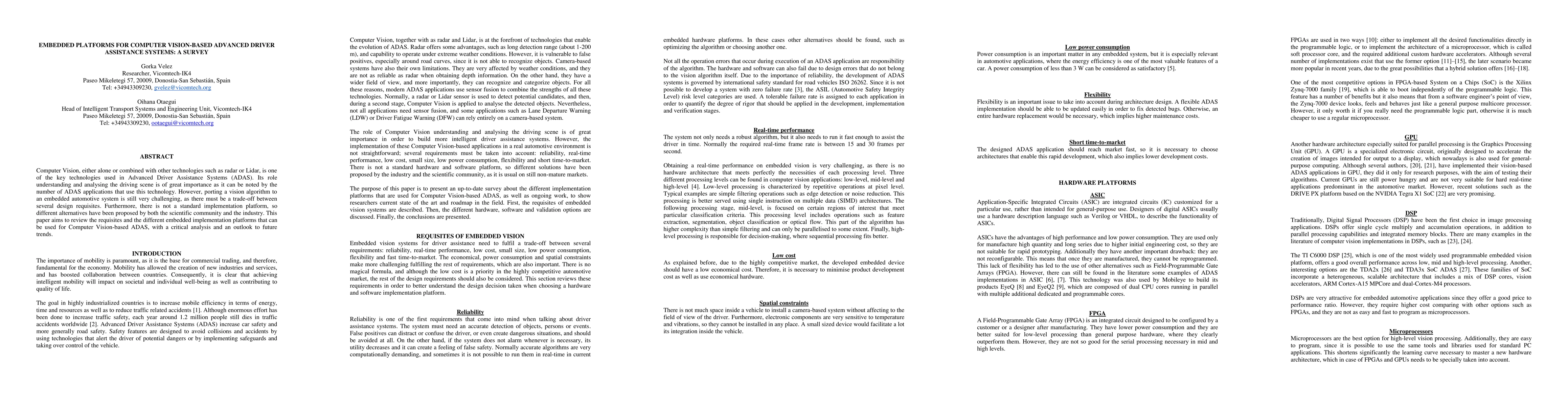 This paper surveys the requisites and various embedded platforms for implementing Computer Vision in Advanced Driver Assistance Systems (ADAS), highlighting the challenges in porting vision algorithms and providing a critical analysis of current alternatives and future trends.