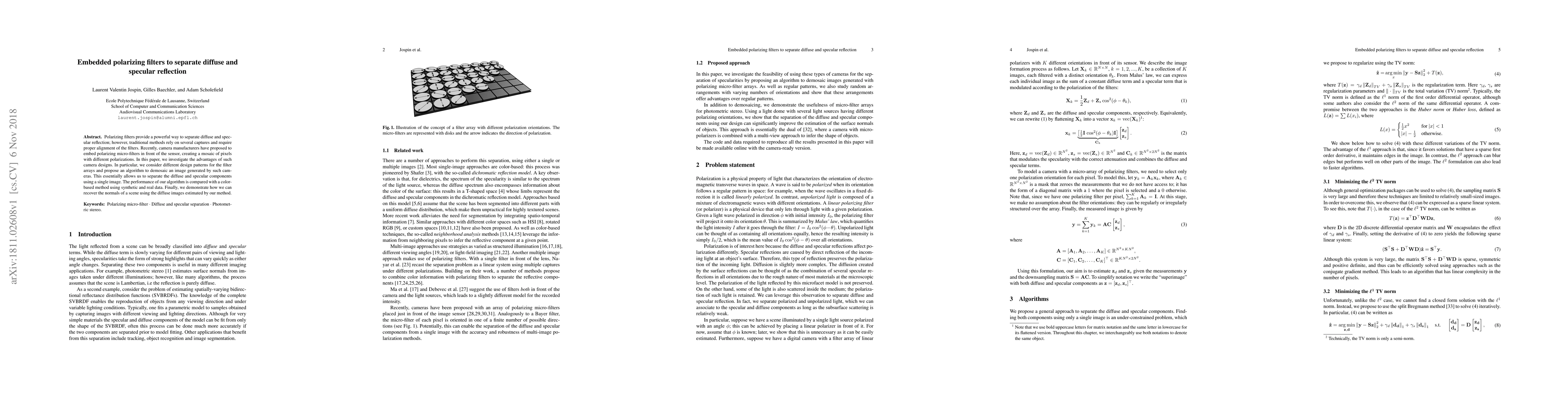 This paper explores embedded polarizing filters in cameras to separate diffuse and specular reflections using a single image, proposing an algorithm to demosaic such images and comparing its performance with a color-based method. The method also enables the recovery of scene normals from the estimated diffuse images.