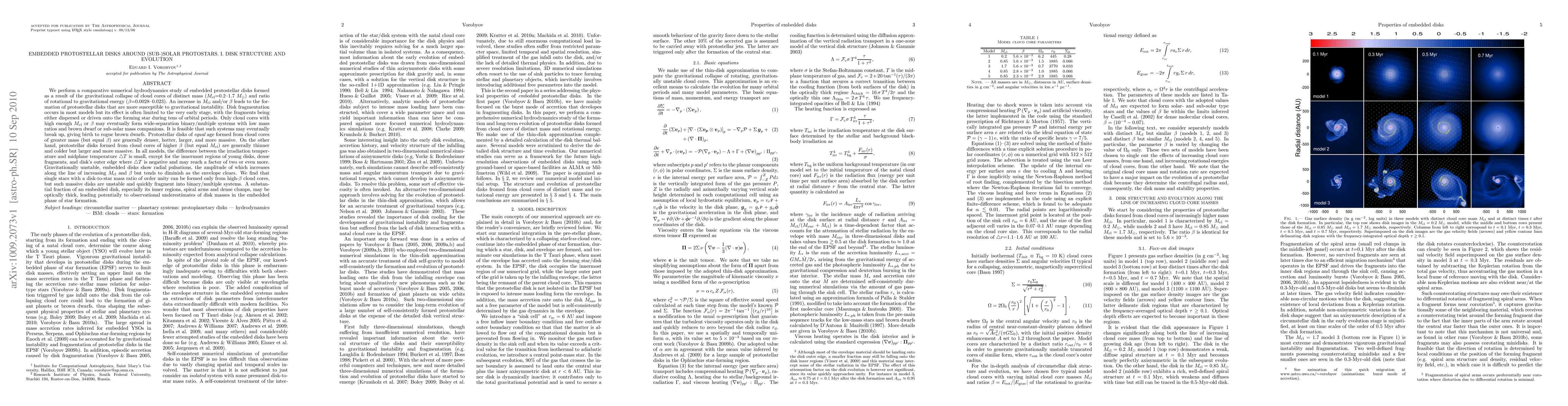 We perform a comparative numerical hydrodynamics study of embedded protostellar disks formed as a result of the gravitational collapse of cloud cores of distinct mass (M_cl=0.2--1.7 M_sun) and ratio of rotational to gravitational energy (\beta=0.0028--0.023). An increase in M_cl and/or \beta leads to the formation of protostellar disks that are more susceptible to gravitational instability. Disk fragmentation occurs in most models but its effect is often limited to the very early stage, with the fragments being either dispersed or driven onto the forming star during tens of orbital periods. Only cloud cores with high enough M_cl or \beta may eventually form wide-separation binary/multiple systems with low mass ratios and brown dwarf or sub-solar mass companions. It is feasible that such systems may eventually break up, giving birth to rogue brown dwarfs. Protostellar disks of {\it equal} age formed from cloud cores of greater mass (but equal \beta) are generally denser, hotter, larger, and more massive. On the other hand, protostellar disks formed from cloud cores of higher \beta (but equal M_cl) are generally thinner and colder but larger and more massive. In all models, the difference between the irradiation temperature and midplane temperature \triangle T is small, except for the innermost regions of young disks, dense fragments, and disk's outer edge where \triangle T is negative and may reach a factor of two or even more. Gravitationally unstable, embedded disks show radial pulsations, the amplitude of which increases along the line of increasing M_cl and \beta but tends to diminish as the envelope clears. We find that single stars with a disk-to-star mass ratio of order unity can be formed only from high-\beta cloud cores, but such massive disks are unstable and quickly fragment into binary/multiple systems.