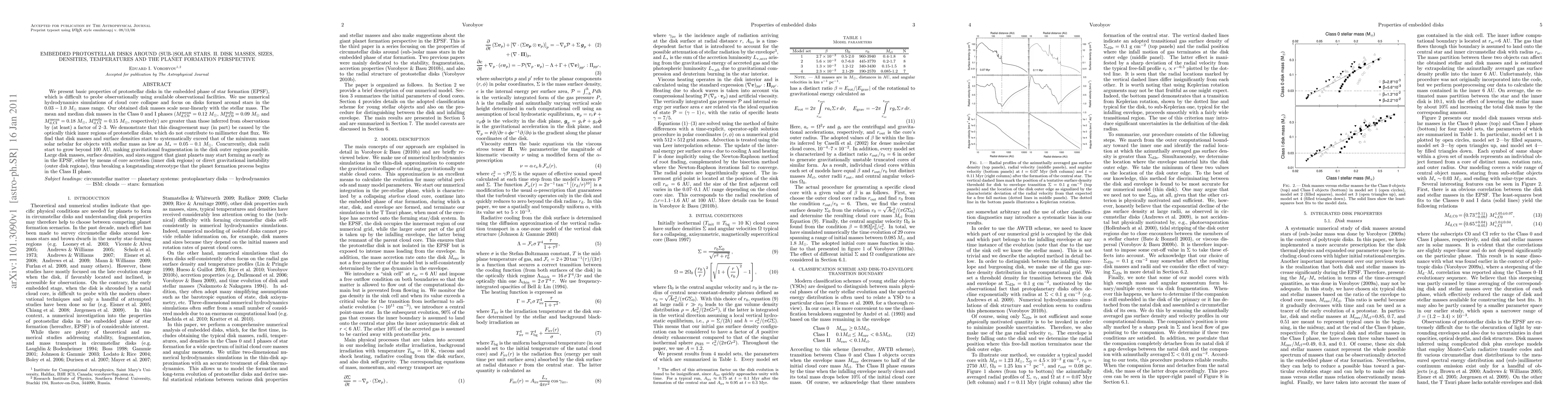 We present basic properties of protostellar disks in the embedded phase of star formation (EPSF), which is difficult to probe observationally using available observational facilities. We use numerical hydrodynamics simulations of cloud core collapse and focus on disks formed around stars in the 0.03-1.0 Msun mass range. Our obtained disk masses scale near-linearly with the stellar mass. The mean and median disk masses in the Class 0 and I phases (M_{d,C0}^{mean}=0.12 Msun, M_{d,C0}^{mdn}=0.09 Msun and M_{d,CI}^{mean}=0.18 Msun, M_{d,CI}^{mdn}=0.15 Msun, respectively) are greater than those inferred from observations by (at least) a factor of 2--3. We demonstrate that this disagreement may (in part) be caused by the optically thick inner regions of protostellar disks, which do not contribute to millimeter dust flux. We find that disk masses and surface densities start to systematically exceed that of the minimum mass solar nebular for objects with stellar mass as low as M_st=0.05-0.1 Msun. Concurrently, disk radii start to grow beyond 100 AU, making gravitational fragmentation in the disk outer regions possible. Large disk masses, surface densities, and sizes suggest that giant planets may start forming as early as in the EPSF, either by means of core accretion (inner disk regions) or direct gravitational instability (outer disk regions), thus breaking a longstanding stereotype that the planet formation process begins in the Class II phase.