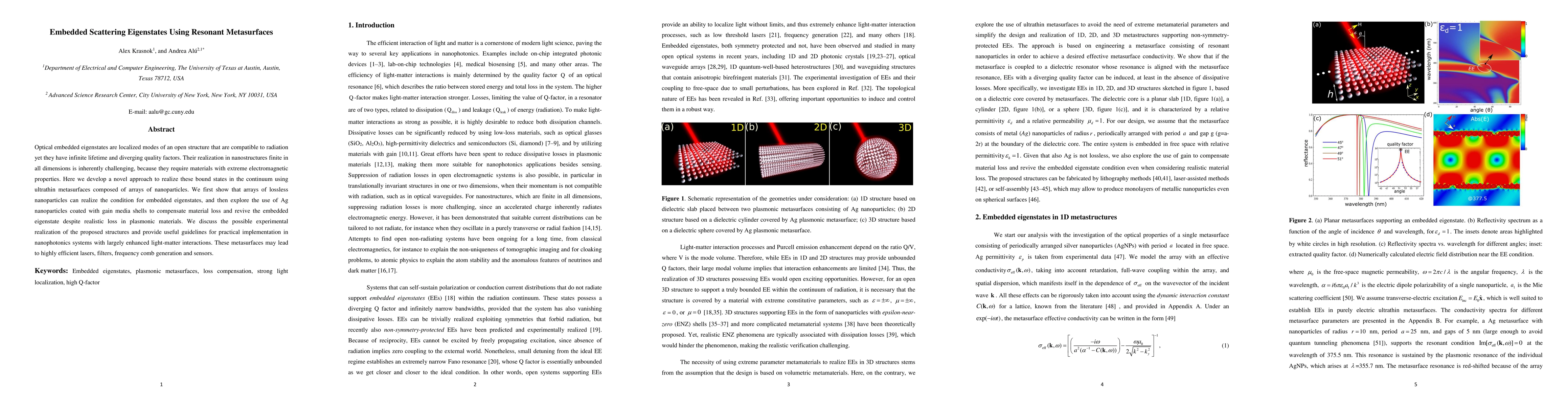 This paper proposes a method to realize optical embedded scattering eigenstates using resonant metasurfaces composed of nanoparticle arrays. By leveraging gain-compensated Ag nanoparticles, the authors demonstrate the potential for infinite lifetime and high quality factors in nanostructures, enabling applications like efficient lasers and sensors.