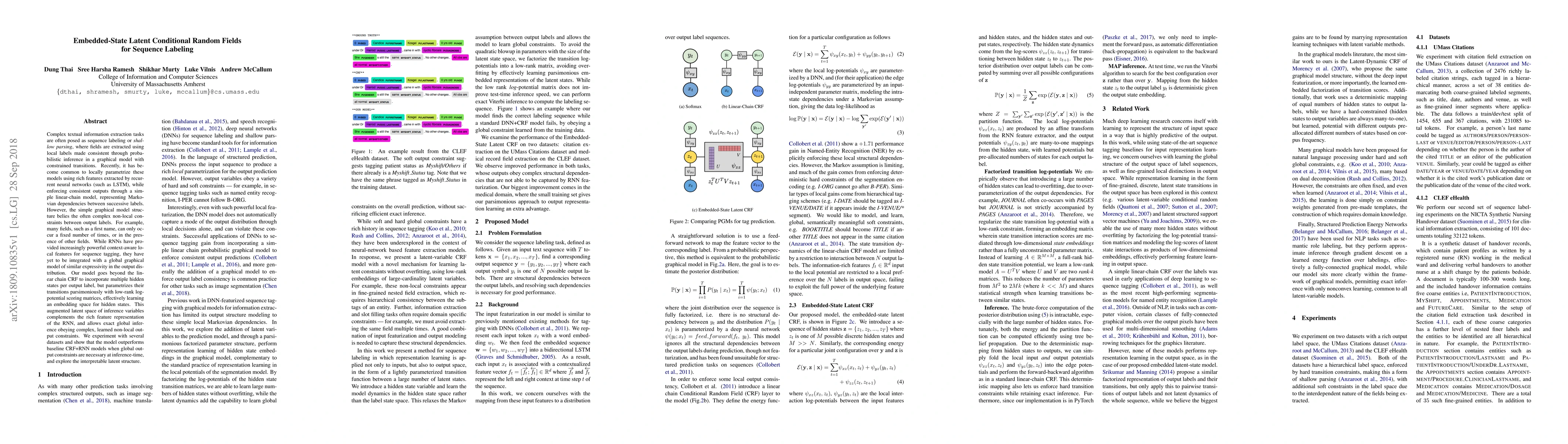 Complex textual information extraction tasks are often posed as sequence labeling or \emph{shallow parsing}, where fields are extracted using local labels made consistent through probabilistic inference in a graphical model with constrained transitions. Recently, it has become common to locally parametrize these models using rich features extracted by recurrent neural networks (such as LSTM), while enforcing consistent outputs through a simple linear-chain model, representing Markovian dependencies between successive labels. However, the simple graphical model structure belies the often complex non-local constraints between output labels. For example, many fields, such as a first name, can only occur a fixed number of times, or in the presence of other fields. While RNNs have provided increasingly powerful context-aware local features for sequence tagging, they have yet to be integrated with a global graphical model of similar expressivity in the output distribution. Our model goes beyond the linear chain CRF to incorporate multiple hidden states per output label, but parametrizes their transitions parsimoniously with low-rank log-potential scoring matrices, effectively learning an embedding space for hidden states. This augmented latent space of inference variables complements the rich feature representation of the RNN, and allows exact global inference obeying complex, learned non-local output constraints. We experiment with several datasets and show that the model outperforms baseline CRF+RNN models when global output constraints are necessary at inference-time, and explore the interpretable latent structure.
