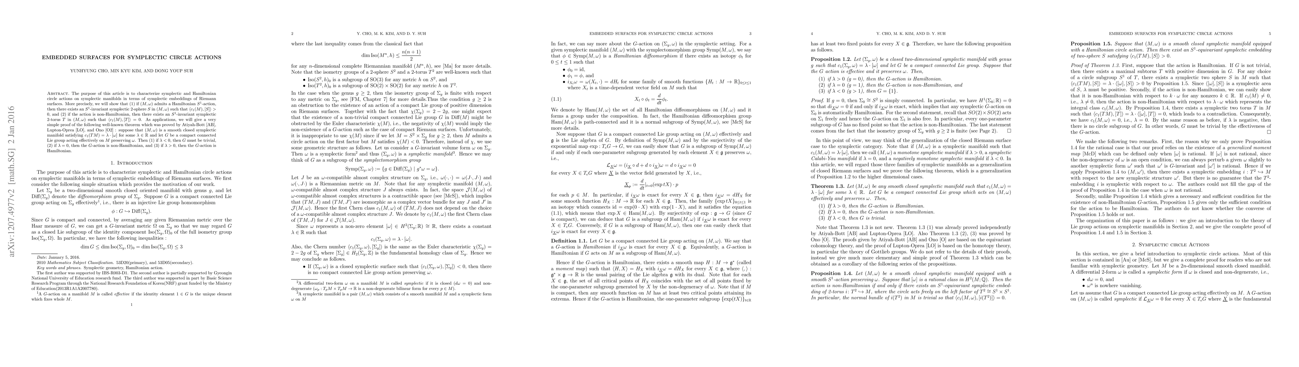 The purpose of this article is to characterize symplectic and Hamiltonian circle actions on symplectic manifolds in terms of symplectic embeddings of Riemann surfaces. More precisely, we will show that (1) if $(M,\omega)$ admits a Hamiltonian $S^1$-action, then there exists an $S^1$-invariant symplectic $2$-sphere $S$ in $(M,\omega)$ such that $\langle c_1(M), [S] \rangle > 0$, and (2) if the action is non-Hamiltonian, then there exists an $S^1$-invariant symplectic $2$-torus $T$ in $(M,\omega)$ such that $\langle c_1(M), [T] \rangle = 0$. As applications, we will give a very simple proof of the following well-known theorem which was proved by Atiyah-Bott \cite{AB}, Lupton-Oprea \cite{LO}, and Ono \cite{O2} : suppose that $(M,\omega)$ is a smooth closed symplectic manifold satisfying $c_1(TM)=\lambda \cdot [\omega]$ for some $\lambda \in \R$ and let $G$ be a compact connected Lie group acting effectively on $M$ preserving $\omega$. Then (1) if $\lambda < 0$, then $G$ must be trivial, (2) if $\lambda=0$, then the $G$-action is non-Hamiltonian, and (3) if $\lambda > 0$, then the $G$-action is Hamiltonian.