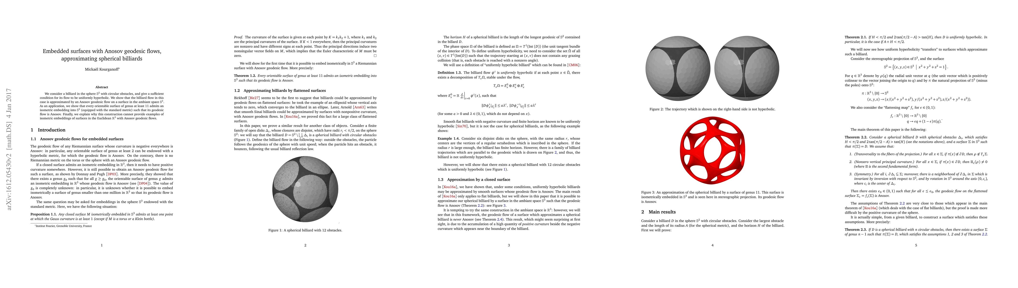 This paper establishes a sufficient condition for the billiard flow in a sphere with circular obstacles to be uniformly hyperbolic, demonstrating that it approximates an Anosov geodesic flow on a surface in S^3. It also proves that any orientable surface of genus at least 11 can be embedded into S^3 with an Anosov geodesic flow, while noting this method fails for embeddings in R^3.