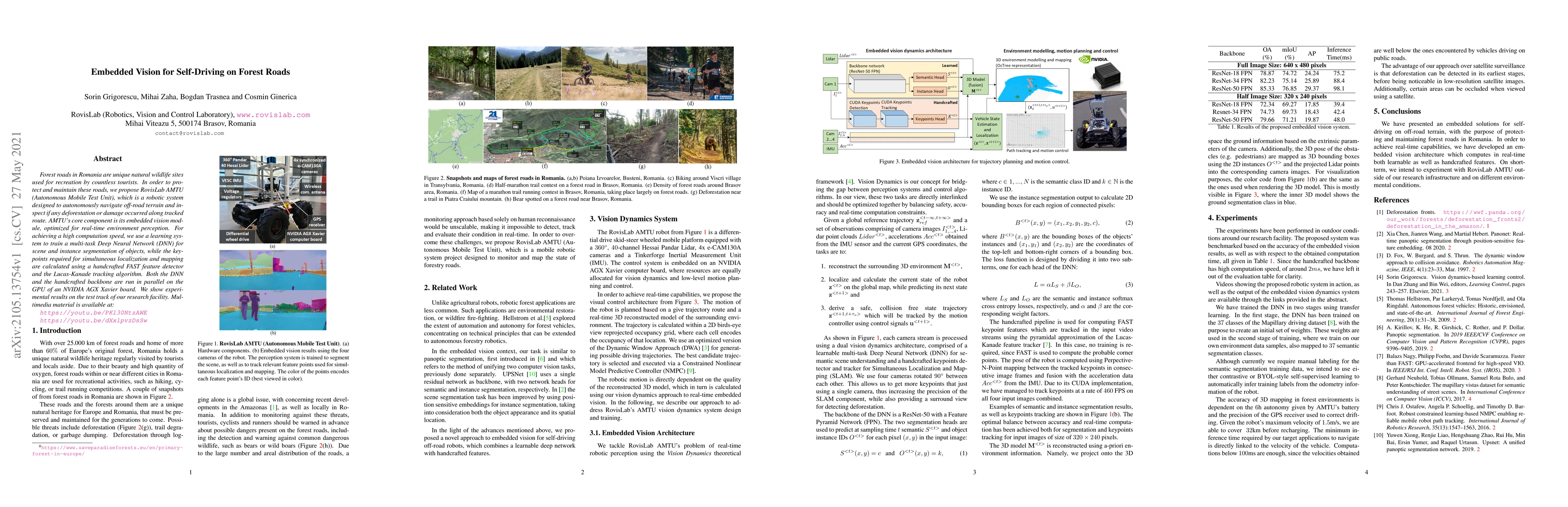 Forest roads in Romania are unique natural wildlife sites used for recreation by countless tourists. In order to protect and maintain these roads, we propose RovisLab AMTU (Autonomous Mobile Test Unit), which is a robotic system designed to autonomously navigate off-road terrain and inspect if any deforestation or damage occurred along tracked route. AMTU's core component is its embedded vision module, optimized for real-time environment perception. For achieving a high computation speed, we use a learning system to train a multi-task Deep Neural Network (DNN) for scene and instance segmentation of objects, while the keypoints required for simultaneous localization and mapping are calculated using a handcrafted FAST feature detector and the Lucas-Kanade tracking algorithm. Both the DNN and the handcrafted backbone are run in parallel on the GPU of an NVIDIA AGX Xavier board. We show experimental results on the test track of our research facility.