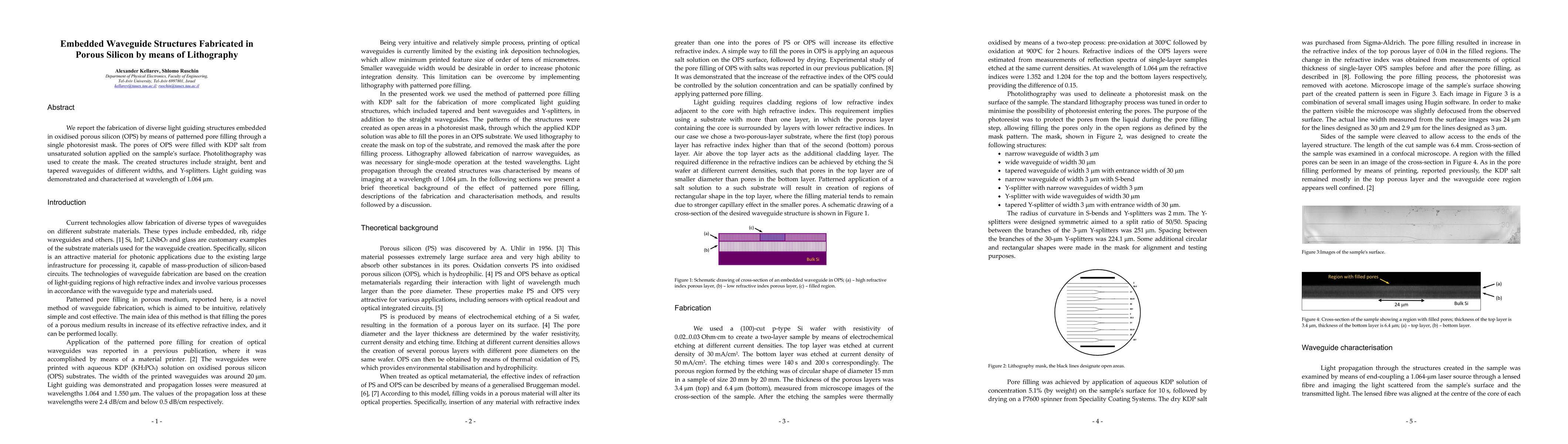 This paper details the fabrication of various embedded waveguide structures in oxidised porous silicon using photolithography and patterned pore filling with KDP salt. The study demonstrates light guiding capabilities at a wavelength of 1.064 microns for straight, bent, tapered waveguides, and Y-splitters.