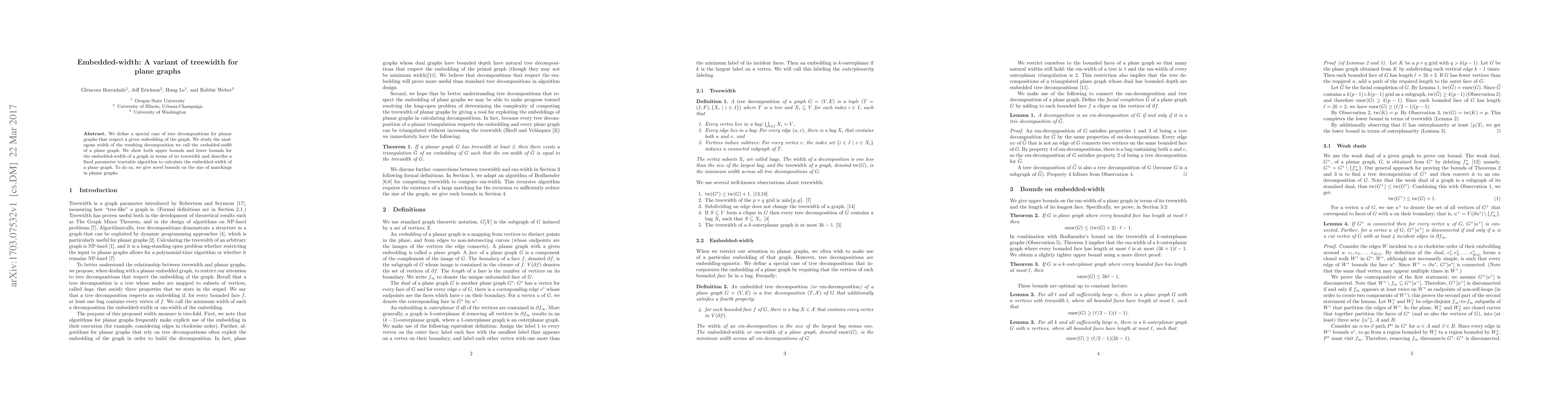 This paper introduces embedded-width, a variant of treewidth tailored for planar graphs that respects their embedding. It presents both upper and lower bounds for embedded-width in relation to treewidth and provides a fixed parameter tractable algorithm to compute it, supported by new bounds on matchings in planar graphs.