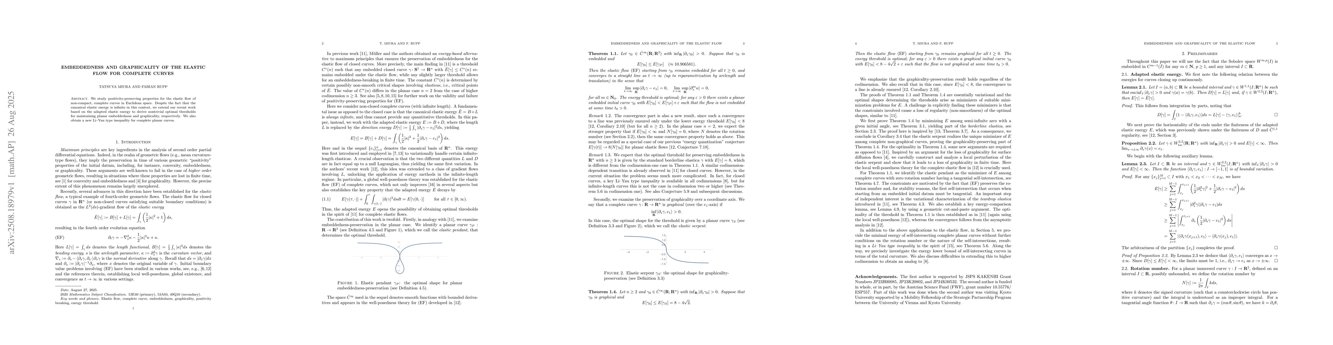 We study positivity-preserving properties for the elastic flow of non-compact, complete curves in Euclidean space. Despite the fact that the canonical elastic energy is infinite in this context, we extend our recent work based on the adapted elastic energy to derive nontrivial optimal thresholds for maintaining planar embeddedness and graphicality, respectively. We also obtain a new Li--Yau type inequality for complete planar curves.