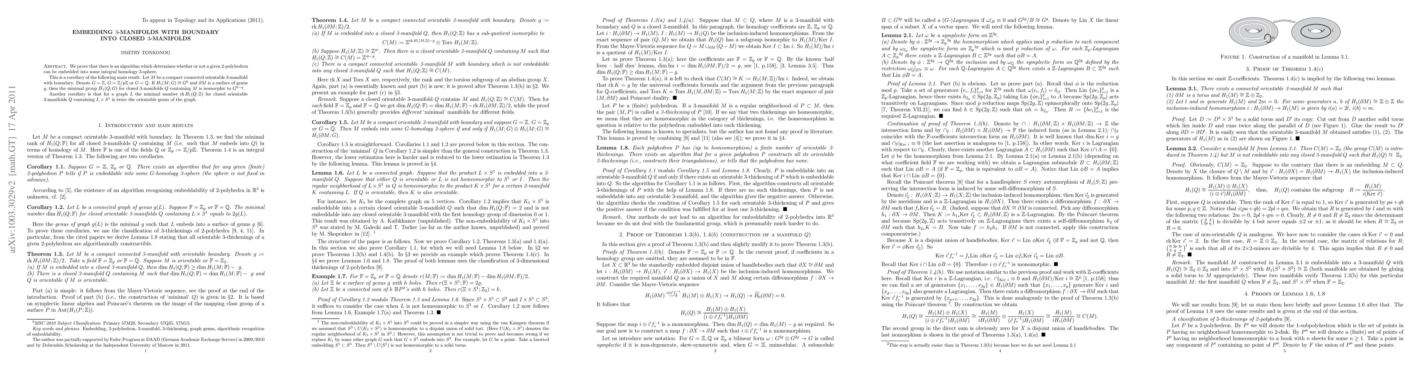 This paper proves an algorithm determining the embeddability of a 2-polyhedron into an integral homology 3-sphere, showing that if $M$ is a 3-manifold with boundary, the minimal first homology group of containing closed 3-manifolds $Q$ is isomorphic to $G^{k-g}$ for $G = \Z$, $\Z/p\Z$, or $\Q$, given certain conditions. It also concludes that the minimal rank of $H_1(Q;\Z)$ for closed 3-manifolds containing a graph $L\times S^1$ is twice the orientable genus of the graph.