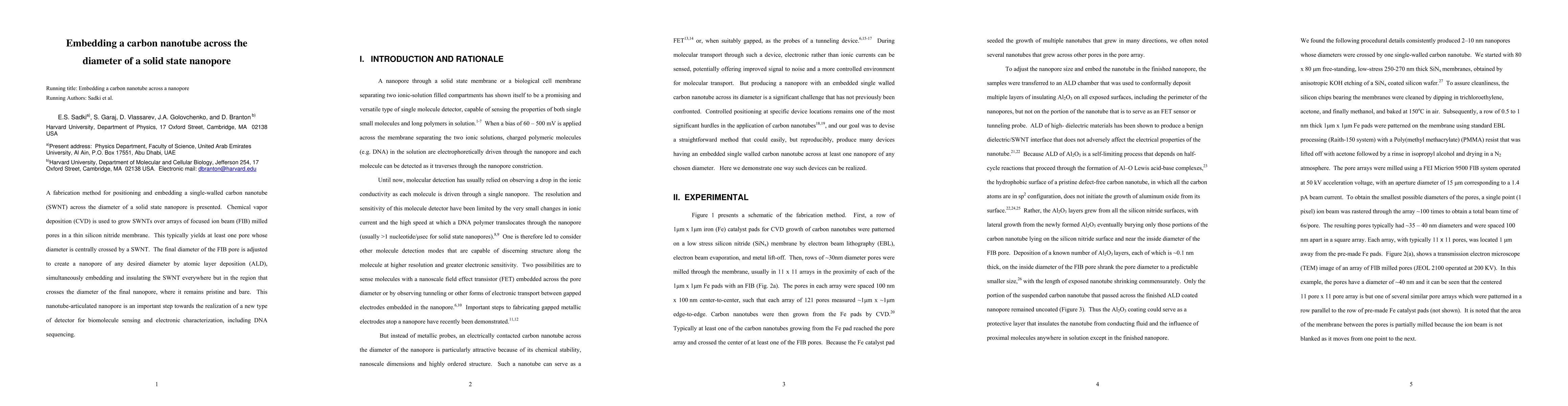 A fabrication method for positioning and embedding a single-walled carbon nanotube across the diameter of a solid state nanopore is presented.