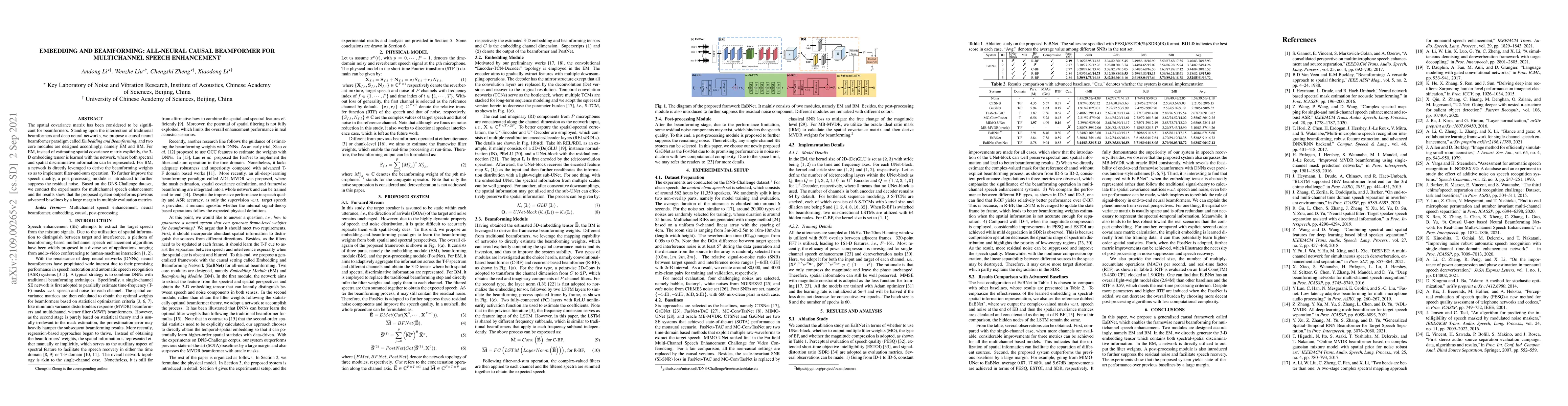 This paper proposes an all-neural causal beamformer named Embedding and Beamforming for multichannel speech enhancement. It learns a 3-D embedding tensor to represent spectral and spatial information, and directly derives beamforming weights through a neural network, outperforming previous methods on the DNS-Challenge dataset.