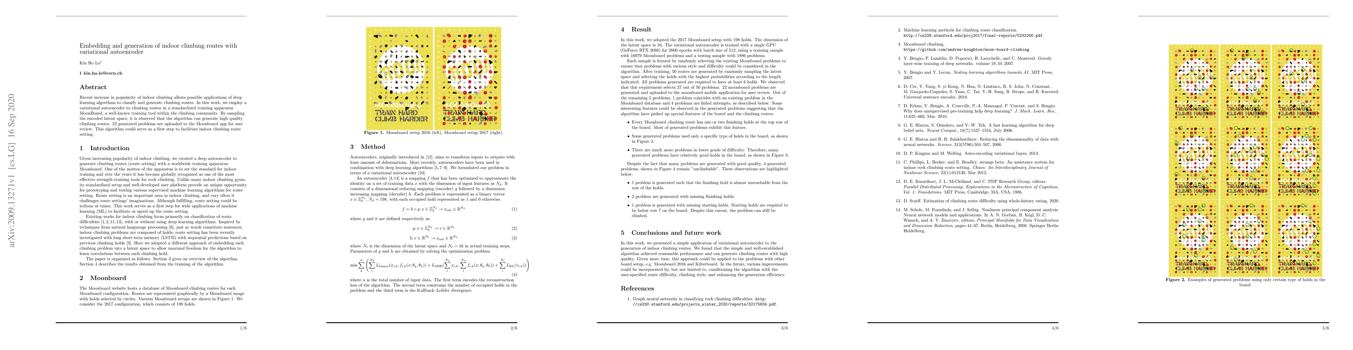 This paper uses a variational autoencoder to classify and generate high-quality indoor climbing routes on the MoonBoard, a popular training tool. The generated routes were reviewed by users, indicating potential for automated indoor climbing route creation.