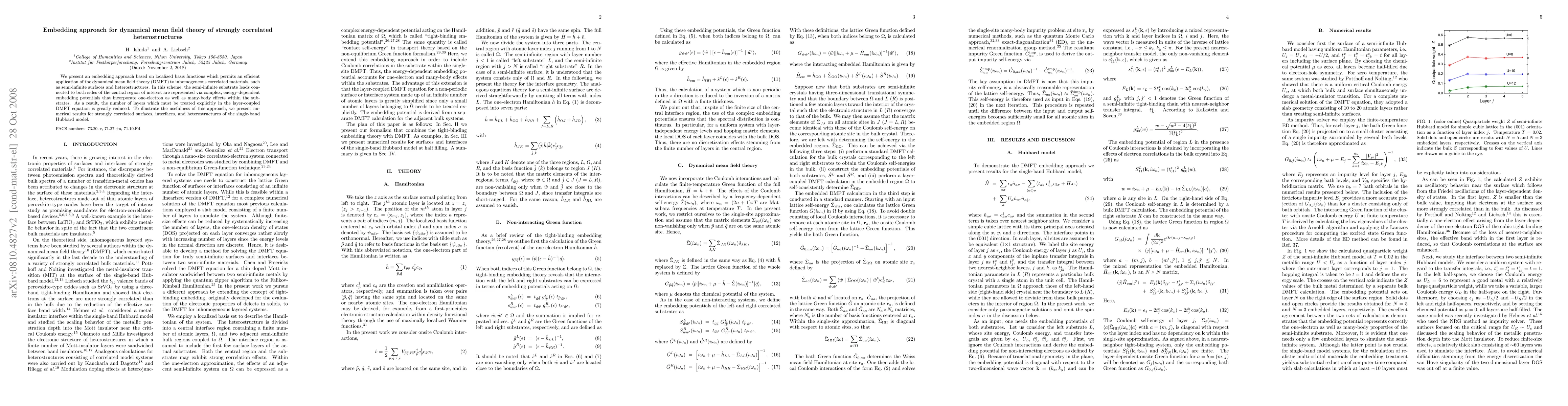 We present an embedding approach based on localized basis functions which permits an efficient application of the dynamical mean field theory (DMFT) to inhomogeneous correlated materials, such as semi-infinite surfaces and heterostructures. In this scheme, the semi-infinite substrate leads connected to both sides of the central region of interest are represented via complex, energy-dependent embedding potentials that incorporate one-electron as well as many-body effects within the substrates. As a result, the number of layers which must be treated explicitly in the layer-coupled DMFT equation is greatly reduced. To illustrate the usefulness of this approach, we present numerical results for strongly correlated surfaces, interfaces, and heterostructures of the single-band Hubbard model.