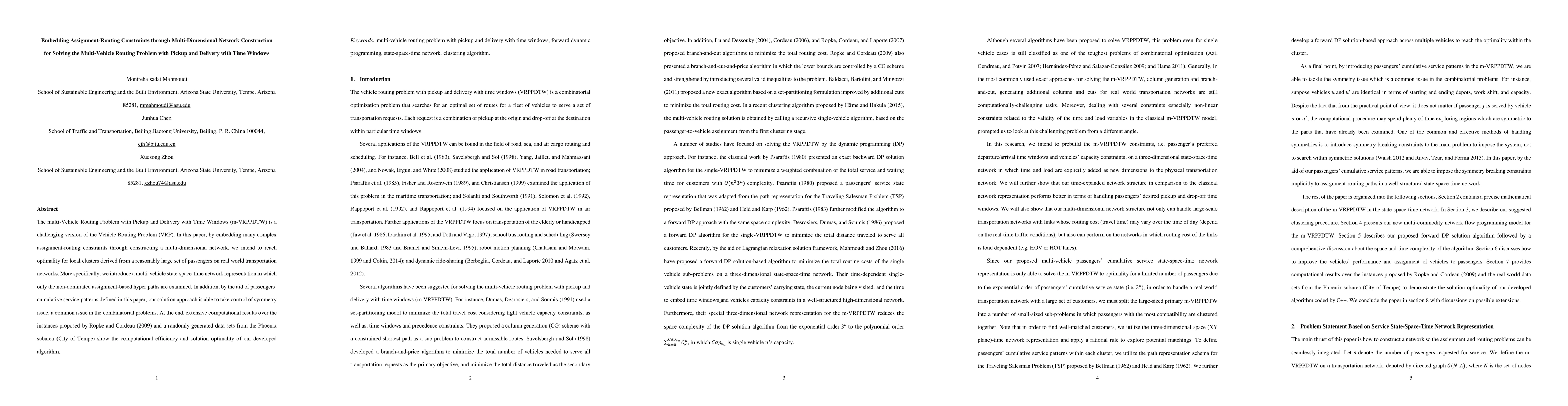 This paper proposes a novel multi-dimensional network construction method to solve the complex Multi Vehicle Routing Problem with Pickup and Delivery and Time Windows, achieving optimality for local clusters and controlling symmetry issues. Computational results demonstrate the efficiency and effectiveness of the developed algorithm.