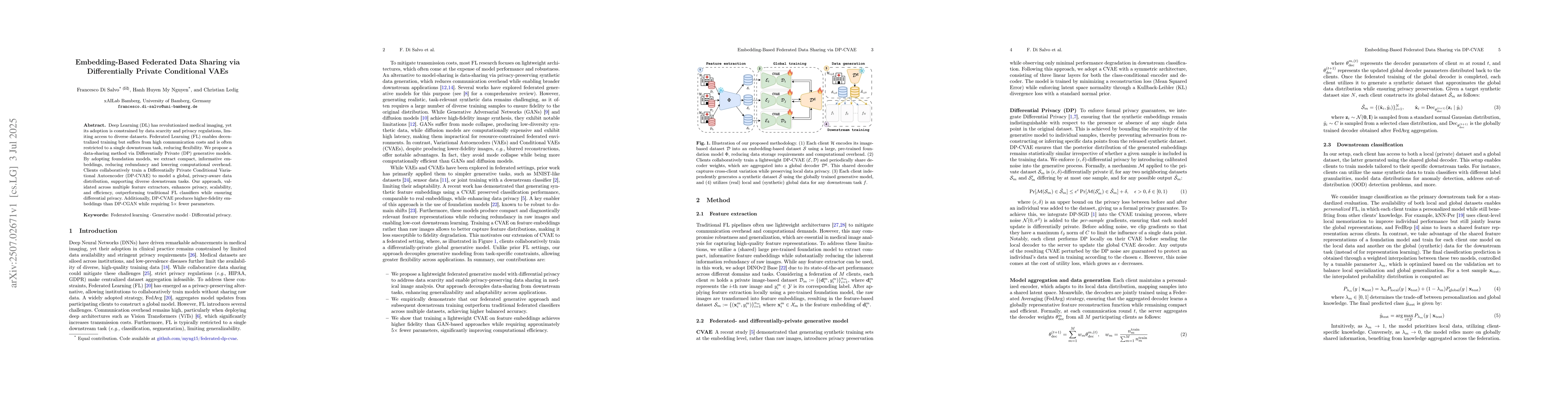 Deep Learning (DL) has revolutionized medical imaging, yet its adoption is constrained by data scarcity and privacy regulations, limiting access to diverse datasets. Federated Learning (FL) enables decentralized training but suffers from high communication costs and is often restricted to a single downstream task, reducing flexibility. We propose a data-sharing method via Differentially Private (DP) generative models. By adopting foundation models, we extract compact, informative embeddings, reducing redundancy and lowering computational overhead. Clients collaboratively train a Differentially Private Conditional Variational Autoencoder (DP-CVAE) to model a global, privacy-aware data distribution, supporting diverse downstream tasks. Our approach, validated across multiple feature extractors, enhances privacy, scalability, and efficiency, outperforming traditional FL classifiers while ensuring differential privacy. Additionally, DP-CVAE produces higher-fidelity embeddings than DP-CGAN while requiring $5{\times}$ fewer parameters.