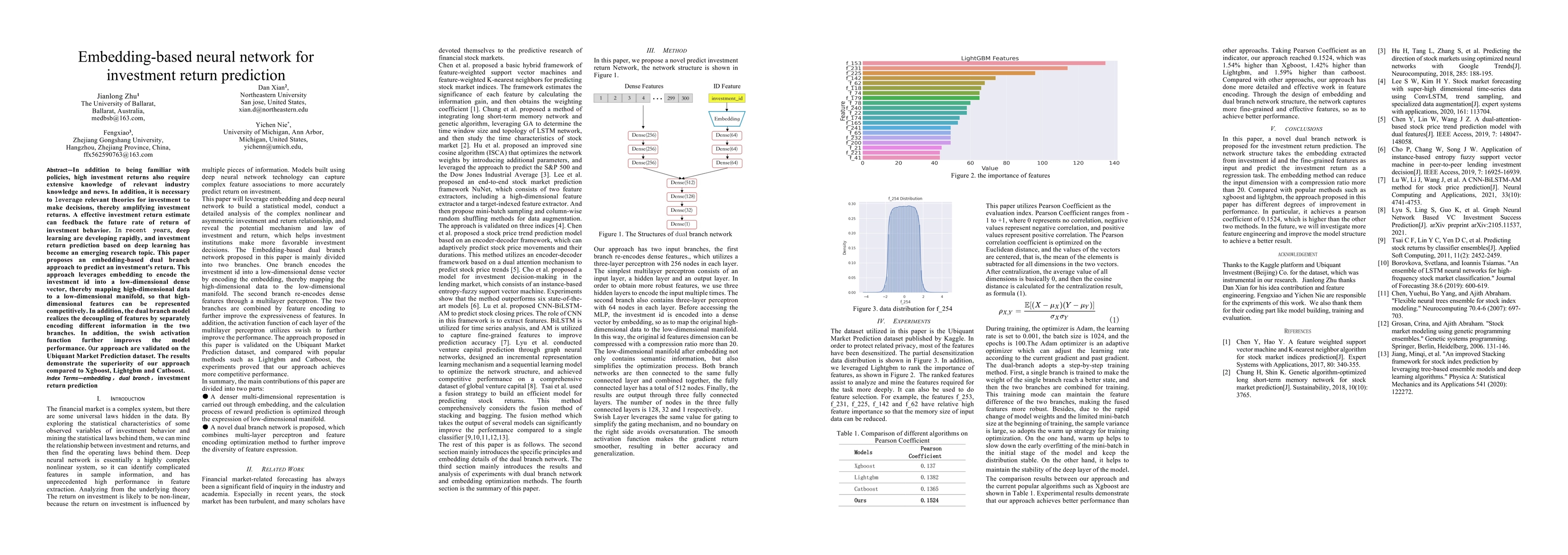 This paper proposes an embedding-based dual branch neural network for investment return prediction, utilizing embedding to encode high-dimensional data and a dual branch model to decouple features. The approach outperforms traditional methods like Xgboost, Lightgbm, and Catboost on the Ubiquant Market Prediction dataset.