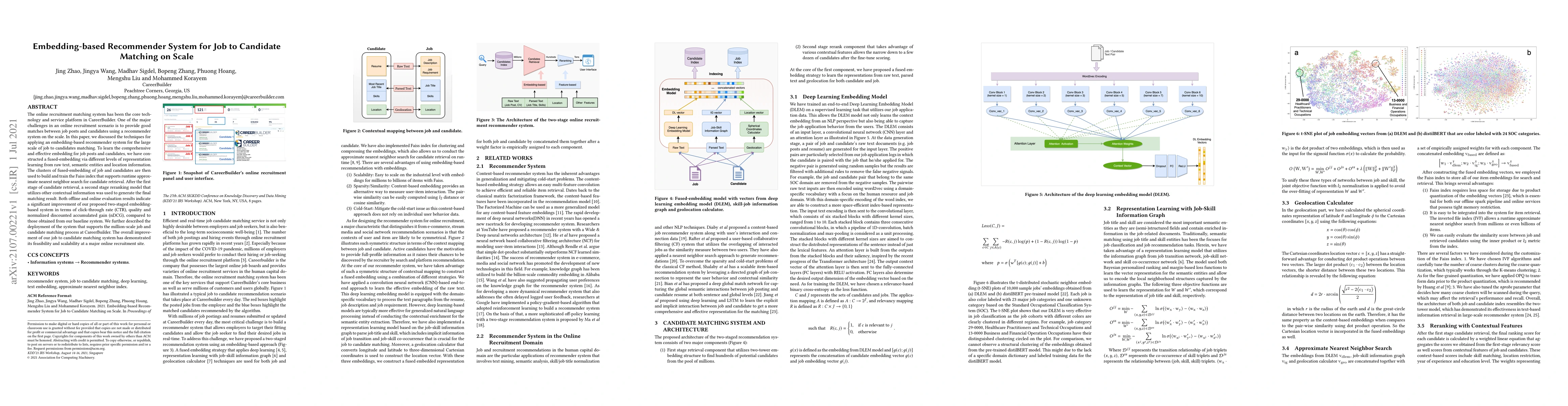 This paper proposes an embedding-based recommender system for large-scale job-to-candidate matching, utilizing fused-embeddings from text, semantic entities, and location data. The system employs a two-stage approach with Faiss index for efficient candidate retrieval and reranking for final matching, showing improved CTR and nDCG over baseline methods.