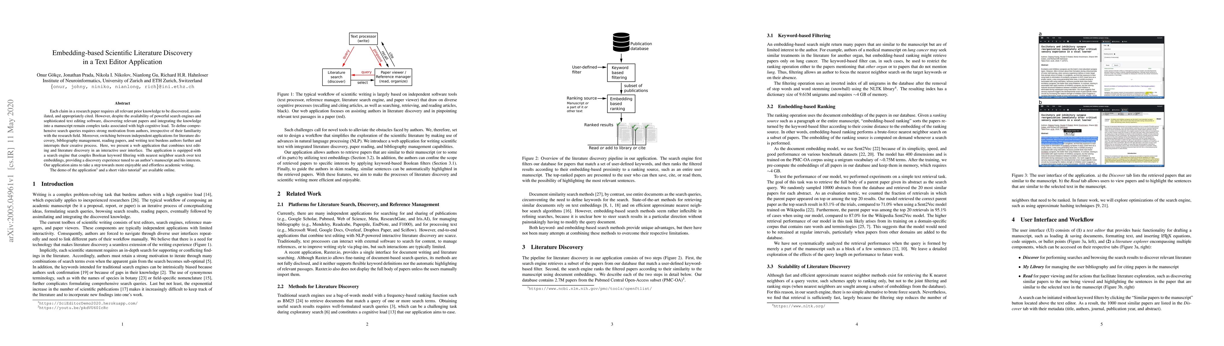This paper introduces a web application that integrates text editing with scientific literature discovery, aiming to reduce the cognitive load of authors by combining these tasks in a single interface. The application uses a search engine that combines Boolean queries with text embeddings for more personalized literature discovery.