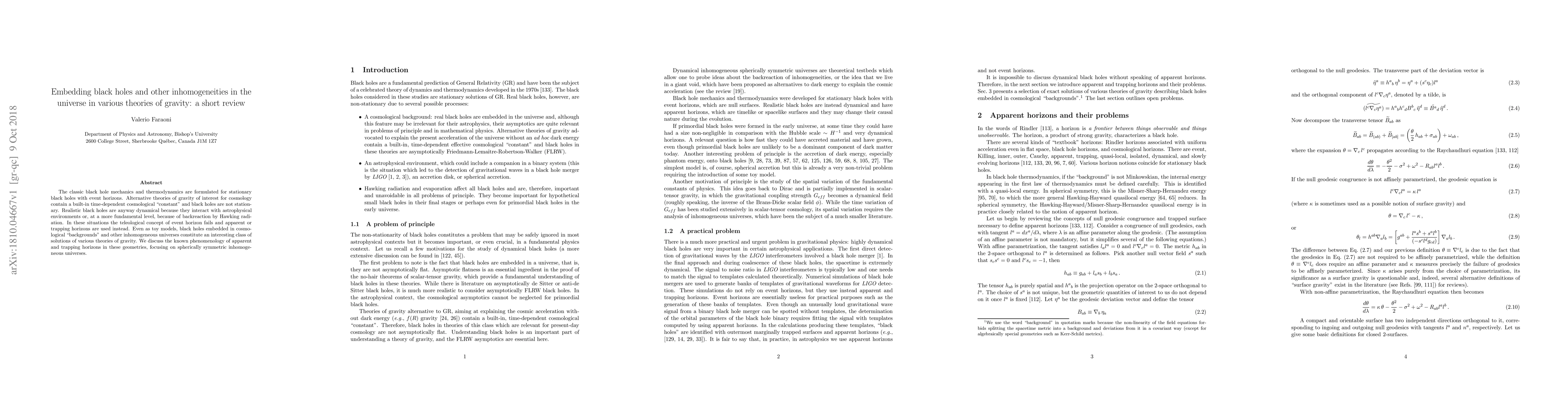 This paper reviews the embedding of black holes and other inhomogeneities in various alternative theories of gravity, emphasizing the challenges posed by time-dependent cosmological constants and the use of apparent or trapping horizons instead of event horizons. It focuses on spherically symmetric inhomogeneous universes and discusses the phenomenology of these horizons.