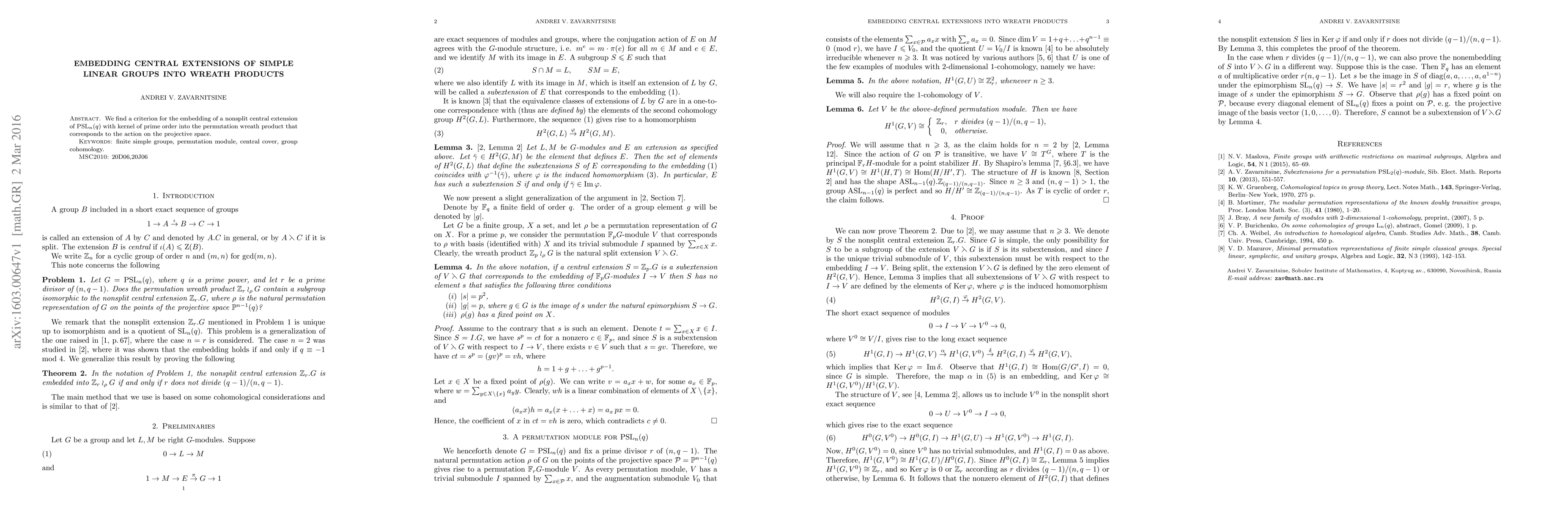 Summary: The paper establishes a criterion for embedding nonsplit central extensions of $PSL_n(q)$ with prime-order kernels into permutation wreath products associated with projective space actions. This provides insight into the structural properties of these group extensions.