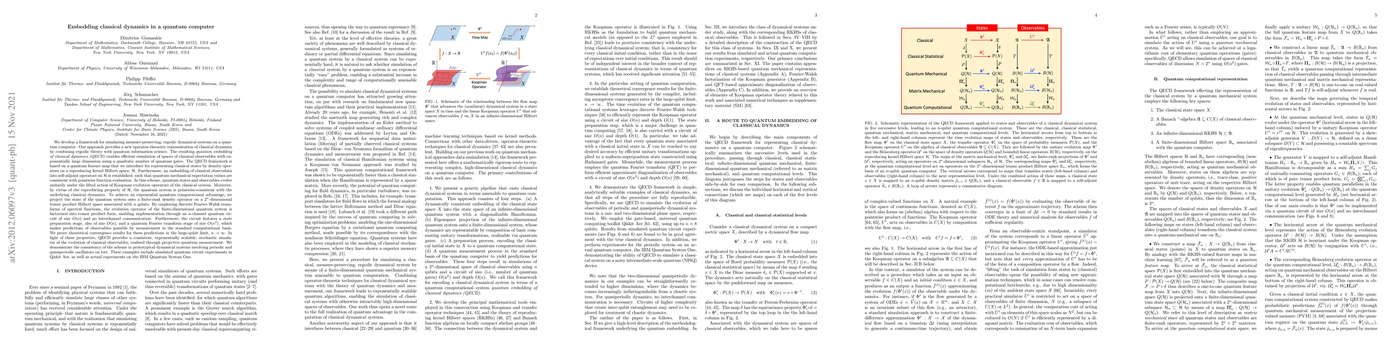 We develop a framework for simulating measure-preserving, ergodic dynamical systems on a quantum computer. Our approach provides a new operator-theoretic representation of classical dynamics by combining ergodic theory with quantum information science. The resulting quantum embedding of classical dynamics (QECD) enables efficient simulation of spaces of classical observables with exponentially large dimension using a quadratic number of quantum gates. The QECD framework is based on a quantum feature map for representing classical states by density operators on a reproducing kernel Hilbert space, $\mathcal H $, and an embedding of classical observables into self-adjoint operators on $\mathcal H$. In this scheme, quantum states and observables evolve unitarily under the lifted action of Koopman evolution operators of the classical system. Moreover, by virtue of the reproducing property of $\mathcal H$, the quantum system is pointwise-consistent with the underlying classical dynamics. To achieve an exponential quantum computational advantage, we project the state of the quantum system to a density matrix on a $2^n$-dimensional tensor product Hilbert space associated with $n$ qubits. By employing discrete Fourier-Walsh transforms, the evolution operator of the finite-dimensional quantum system is factorized into tensor product form, enabling implementation through a quantum circuit of size $O(n)$. Furthermore, the circuit features a state preparation stage, also of size $O(n)$, and a quantum Fourier transform stage of size $O(n^2)$, which makes predictions of observables possible by measurement in the standard computational basis. We prove theoretical convergence results for these predictions as $n\to\infty$. We present simulated quantum circuit experiments in Qiskit Aer, as well as actual experiments on the IBM Quantum System One.