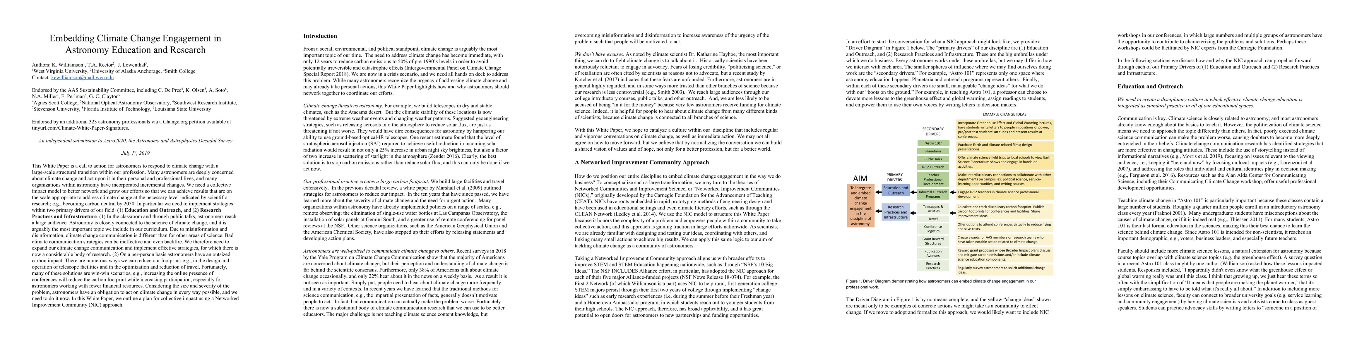 This White Paper is a call to action for astronomers to respond to climate change with a large structural transition within our profession. Many astronomers are deeply concerned about climate change and act upon it in their personal and professional lives, and many organizations within astronomy have incorporated incremental changes. We need a collective impact model to better network and grow our efforts so that we can achieve results that are on the scale appropriate to address climate change at the necessary level indicated by scientific research; e.g., becoming carbon neutral by 2050. We need to implement strategies within two primary drivers of our field: (1) Education and Outreach, and (2) Research Practices and Infrastructure. (1) In the classroom and through public talks, astronomers reach a large audience. Astronomy is closely connected to the science of climate change, and it is arguably the most important topic we include in our curriculum. Due to misinformation and disinformation, climate change communication is different than for other areas of science. We therefore need to expand our communication and implement effective strategies, for which there is now a considerable body of research. (2) On a per-person basis astronomers have an outsized carbon impact. There are numerous ways we can reduce our footprint; e.g., in the design and operation of telescope facilities and in the optimization and reduction of travel. Fortunately, many of these solutions are win-win scenarios, e.g., increasing the online presence of conferences will reduce the carbon footprint while increasing participation, especially for astronomers working with fewer financial resources. Astronomers have an obligation to act on climate change in every way possible, and we need to do it now. In this White Paper, we outline a plan for collective impact using a Networked Improvement Community (NIC) approach.