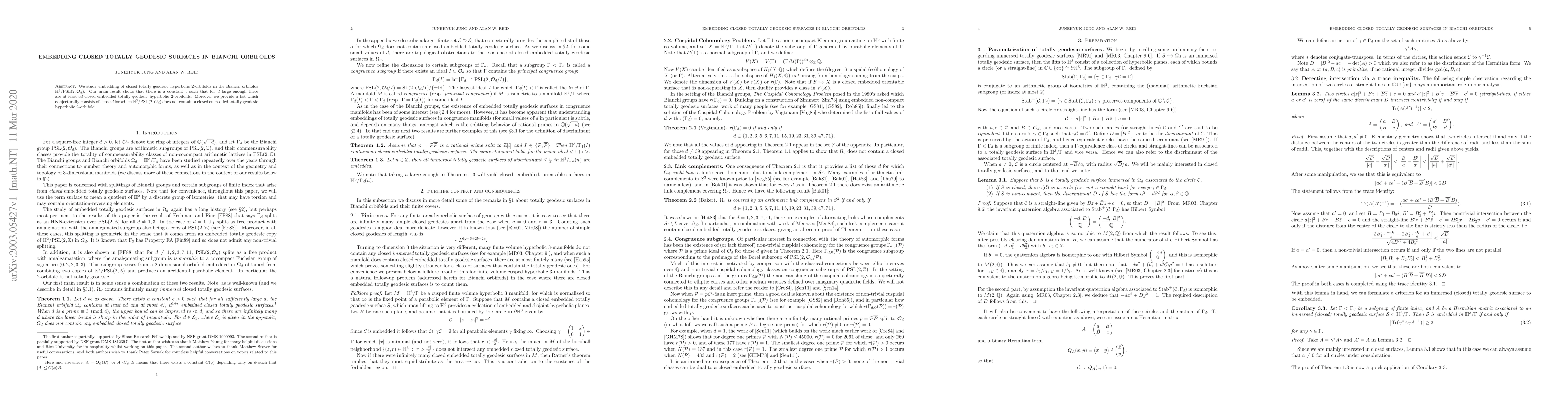 We study embedding of closed totally geodesic hyperbolic 2-orbifolds in the Bianchi orbifolds $\mathbb{H}^3/PSL(2,\mathcal{O}_d)$. Our main result shows that there is a constant $c$ such that for $d$ large enough there are at least $cd$ closed embedded totally geodesic hyperbolic 2-orbifolds. Moreover we provide a list which conjecturally consists of those $d$ for which $\mathbb{H}^3/PSL(2,\mathcal{O}_d)$ does not contain a closed embedded totally geodesic hyperbolic 2-orbifold.