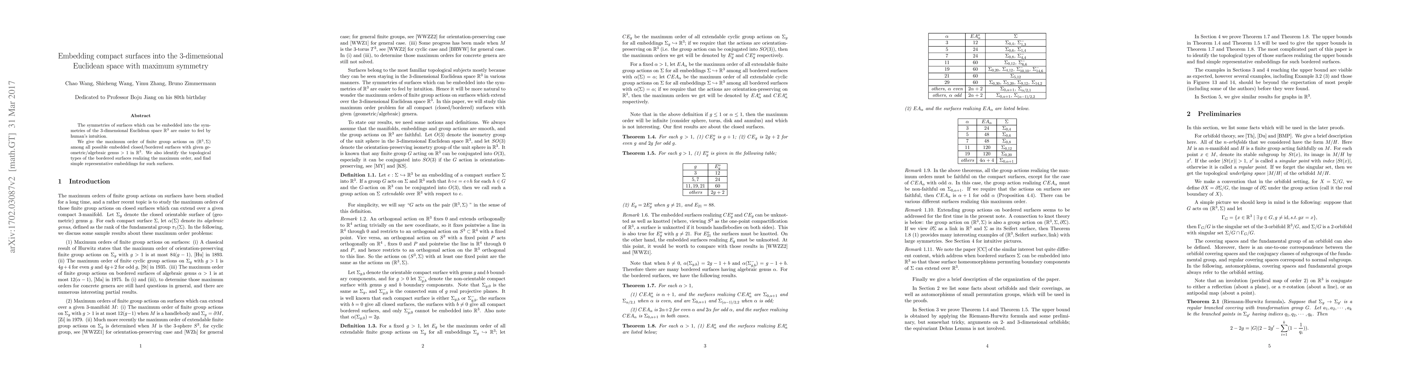 This paper determines the highest order of finite group symmetries for compact surfaces embedded in $\mathbb{R}^3$ with genus greater than 1, identifying the topological types and providing representative embeddings for these surfaces.
