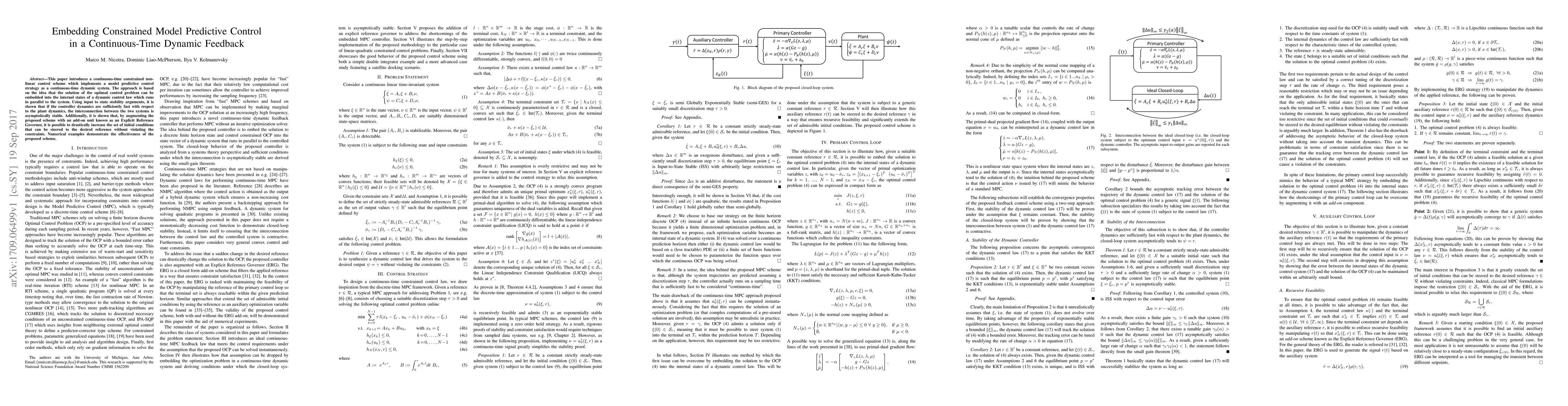 A new control scheme is proposed that embeds a constrained model predictive control strategy into a continuous-time dynamic system, enabling asymptotic stability and improved performance with an additional reference governor.