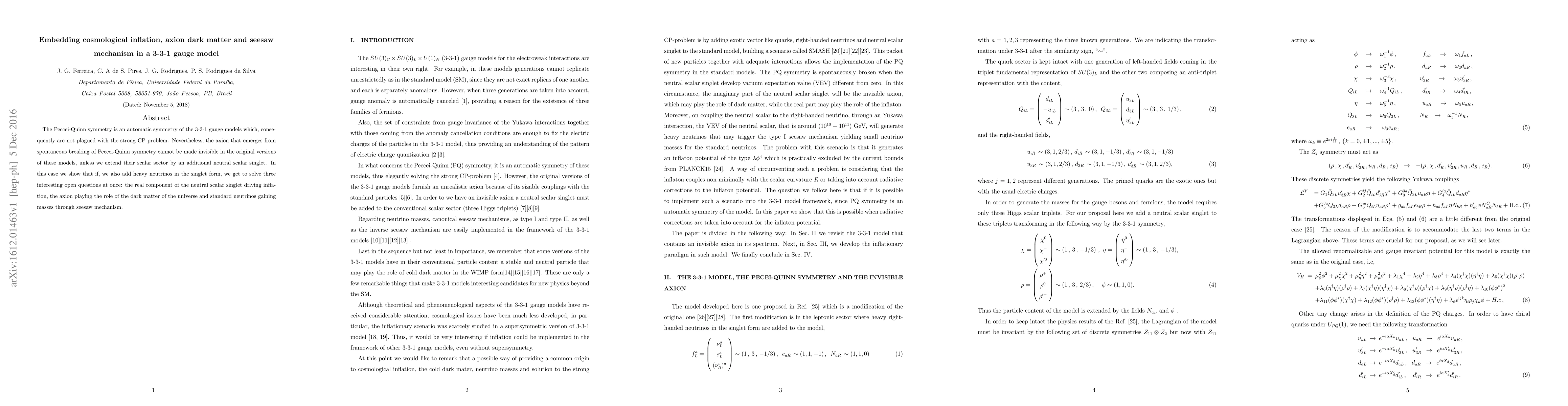 This paper explores a 3-3-1 gauge model incorporating Peccei-Quinn symmetry to address the strong CP problem, and extends the model with an additional neutral scalar and heavy singlet neutrinos to simultaneously explain cosmological inflation, axion dark matter, and the seesaw mechanism for neutrino masses.
