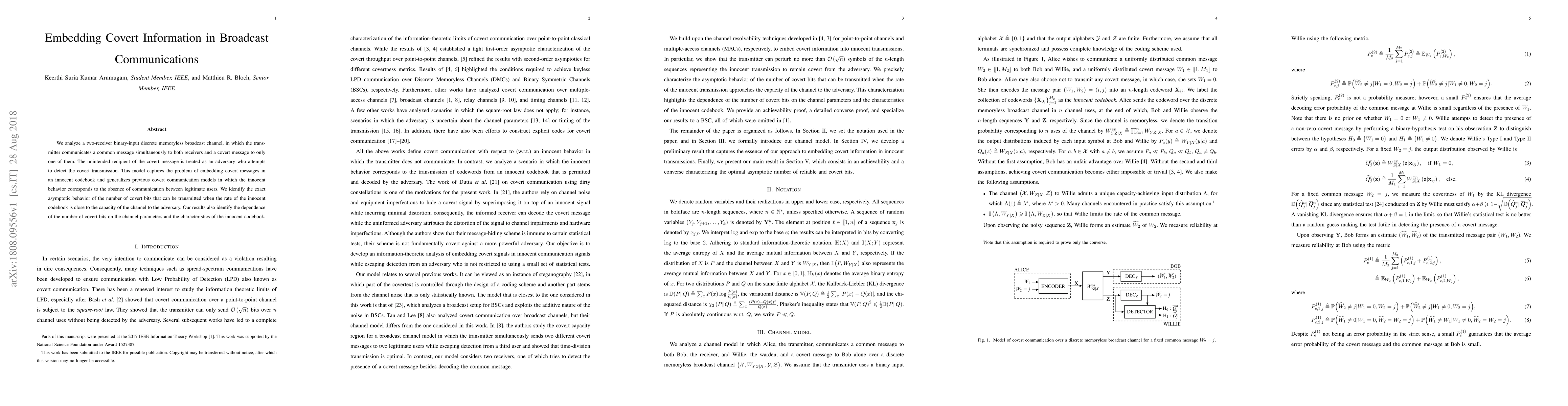 We analyze a two-receiver binary-input discrete memoryless broadcast channel, in which the transmitter communicates a common message simultaneously to both receivers and a covert message to only one of them. The unintended recipient of the covert message is treated as an adversary who attempts to detect the covert transmission. This model captures the problem of embedding covert messages in an innocent codebook and generalizes previous covert communication models in which the innocent behavior corresponds to the absence of communication between legitimate users. We identify the exact asymptotic behavior of the number of covert bits that can be transmitted when the rate of the innocent codebook is close to the capacity of the channel to the adversary. Our results also identify the dependence of the number of covert bits on the channel parameters and the characteristics of the innocent codebook.