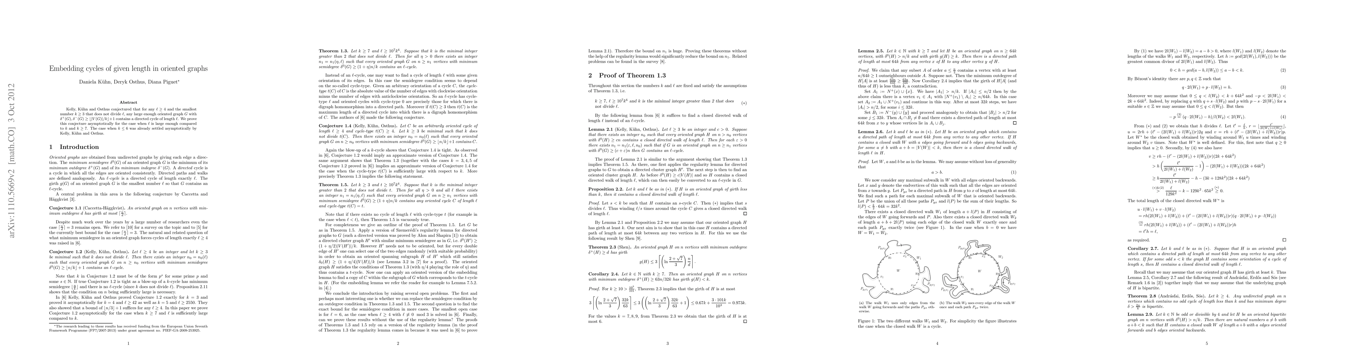 This research proves an oriented graph conjecture by Kelly, Kuehn, and Osthus asymptotically for large l and k > 6, confirming that an oriented graph with specified indegree and outdegree conditions contains a directed cycle of length l. The case for k < 7 was previously resolved.