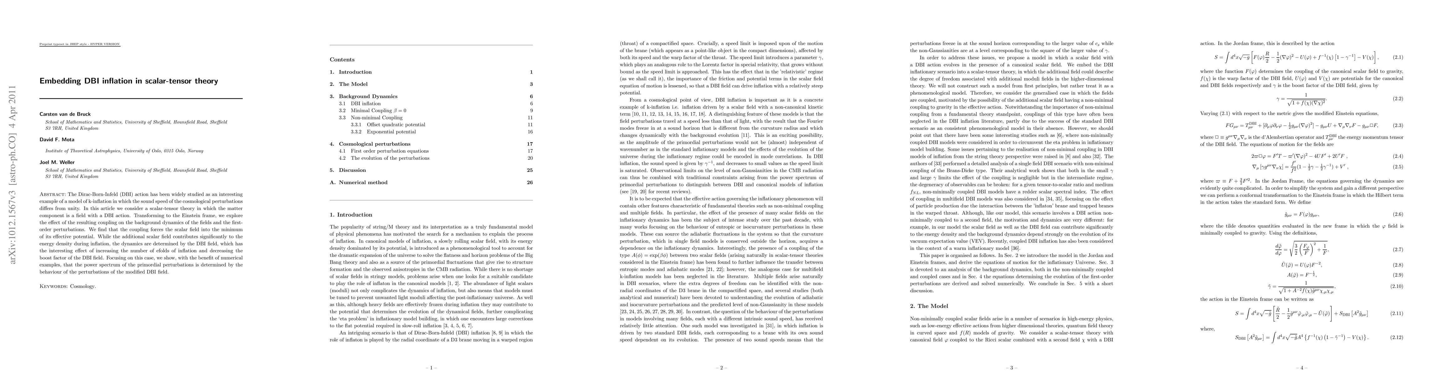 This paper explores a scalar-tensor theory with a Dirac-Born-Infeld (DBI) field, demonstrating how the coupling affects inflationary dynamics and the primordial power spectrum. The DBI field influences the number of efolds and decreases the boost factor, while the power spectrum of perturbations is determined by the modified DBI field's behavior.