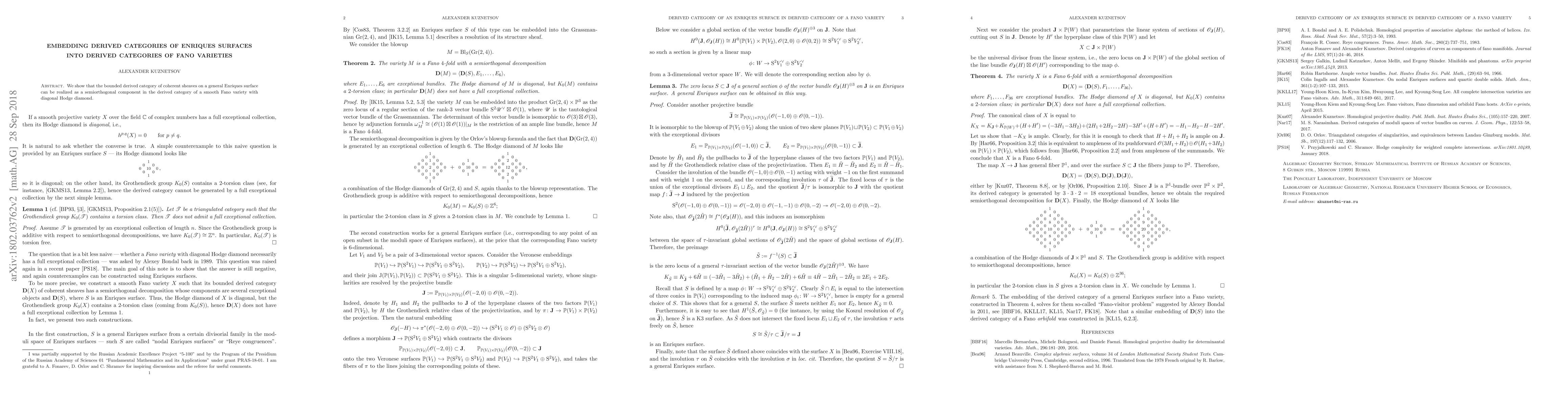 We show that the derived category of a general Enriques surface can be realized as a semiorthogonal component in the derived category of a smooth Fano variety with a diagonal Hodge diamond.