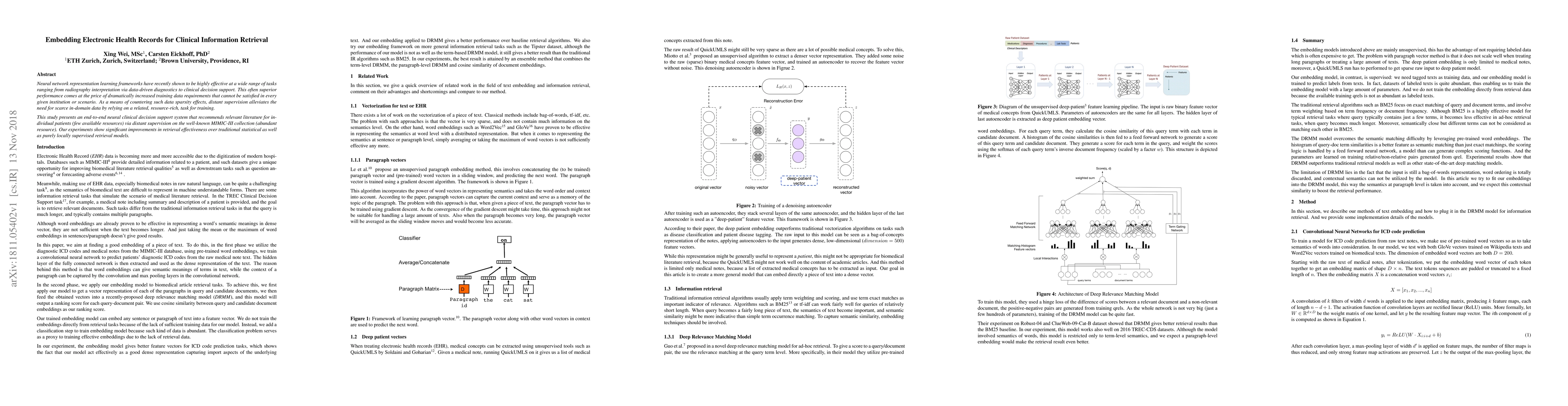 Neural network representation learning frameworks have recently shown to be highly effective at a wide range of tasks ranging from radiography interpretation via data-driven diagnostics to clinical decision support. This often superior performance comes at the price of dramatically increased training data requirements that cannot be satisfied in every given institution or scenario. As a means of countering such data sparsity effects, distant supervision alleviates the need for scarce in-domain data by relying on a related, resource-rich, task for training. This study presents an end-to-end neural clinical decision support system that recommends relevant literature for individual patients (few available resources) via distant supervision on the well-known MIMIC-III collection (abundant resource). Our experiments show significant improvements in retrieval effectiveness over traditional statistical as well as purely locally supervised retrieval models.