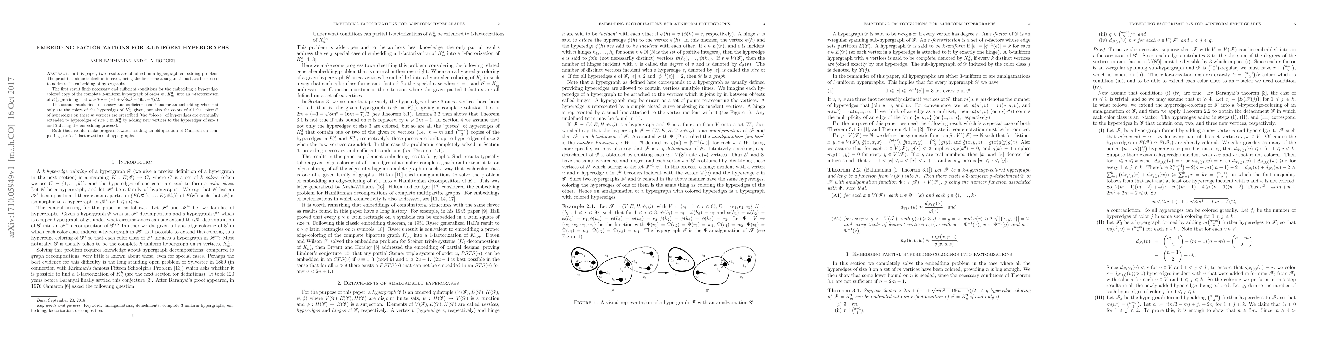 In this paper, two results are obtained on a hypergraph embedding problem. The proof technique is itself of interest, being the first time amalgamations have been used to address the embedding of hypergraphs. The first result finds necessary and sufficient conditions for the embedding a hyperedge-colored copy of the complete 3-uniform hypergraph of order $m$, $K_m^3$, into an $r$-factorization of $K_n^3$, providing that $n> 2m+(-1+\sqrt{8m^2-16m-7})/2$. The second result finds necessary and sufficient conditions for an embedding when not only are the colors of the hyperedges of $K_m^3$ given, but also the colors of all the "pieces" of hyperedges on these $m$ vertices are prescribed (the "pieces" of hyperedges are eventually extended to hyperedges of size 3 in $K_n^3$ by adding new vertices to the hyperedges of size 1 and 2 during the embedding process). Both these results make progress towards settling an old question of Cameron on completing partial 1-factorizations of hypergraphs.