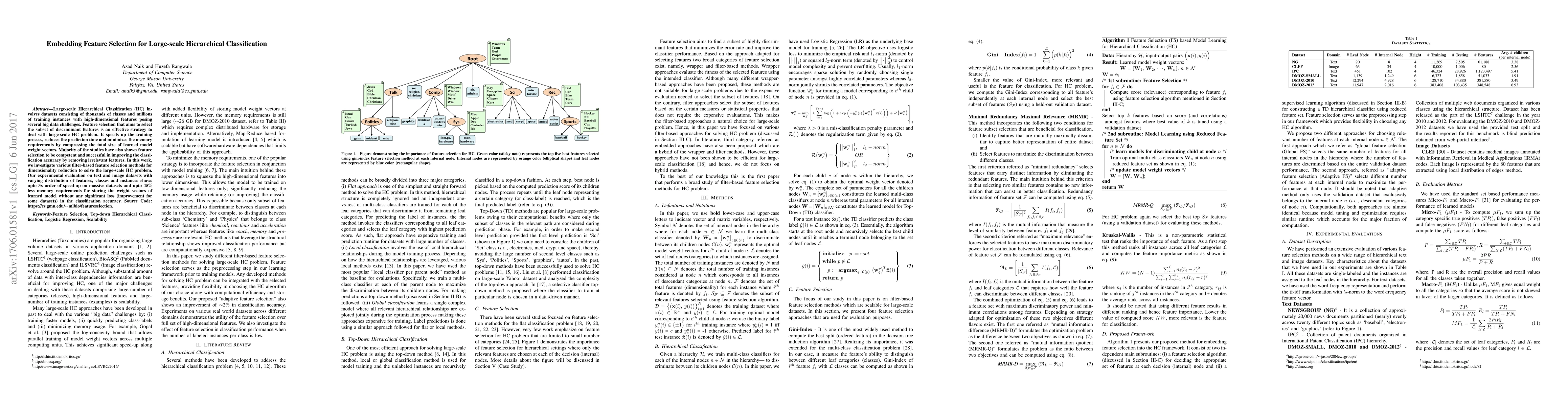 This research paper explores feature selection methods to improve large-scale hierarchical classification accuracy on massive datasets, achieving up to 3x speed-up and 45% memory reduction without sacrificing classification performance.