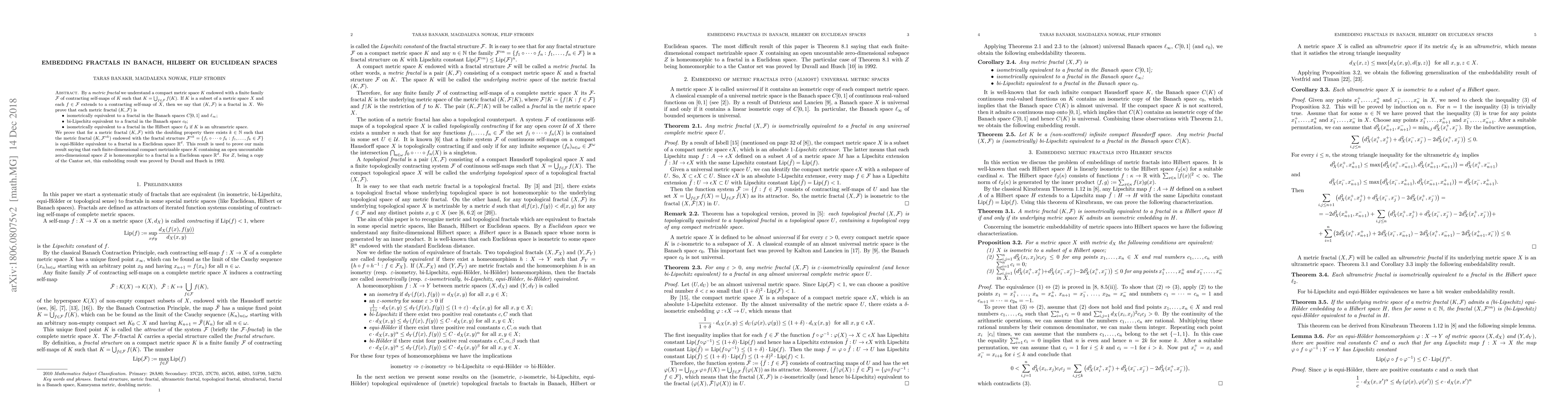 This paper explores the embedding of metric fractals in various metric spaces, proving that any metric fractal is isometrically or bi-Lipschitz equivalent to fractals in Banach, Hilbert, and Euclidean spaces. It also shows that finite-dimensional compact metrizable spaces containing an open uncountable zero-dimensional space can be homeomorphic to fractals in Euclidean space.