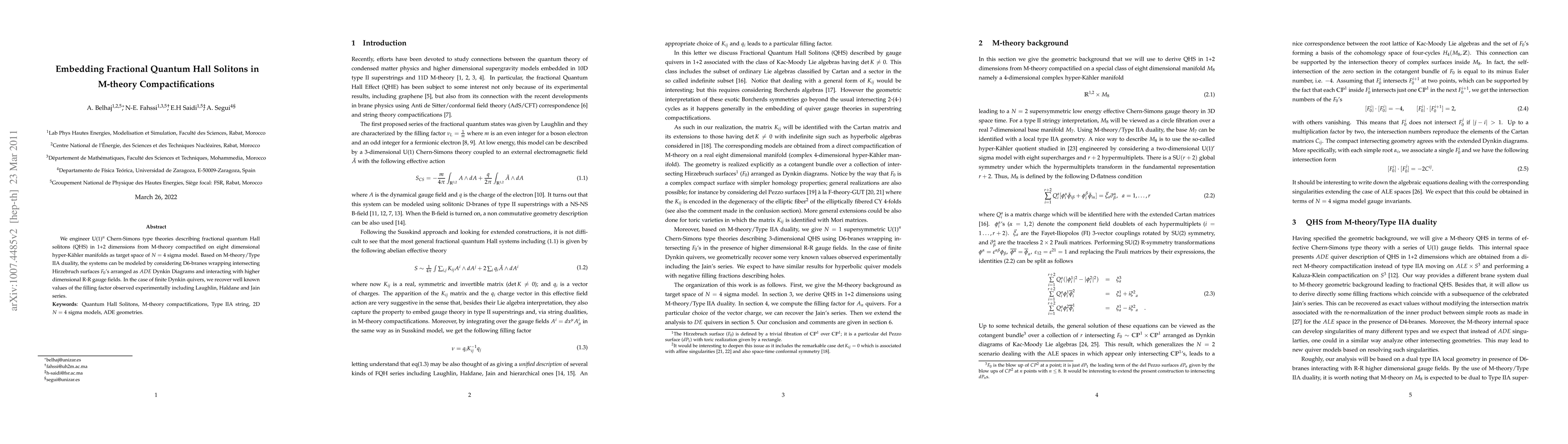 We engineer U(1)^n Chern-Simons type theories describing fractional quantum Hall solitons (QHS) in 1+2 dimensions from M-theory compactified on eight dimensional hyper-K\"{a}hler manifolds as target space of N=4 sigma model. Based on M-theory/Type IIA duality, the systems can be modeled by considering D6-branes wrapping intersecting Hirzebruch surfaces F_0's arranged as ADE Dynkin Diagrams and interacting with higher dimensional R-R gauge fields. In the case of finite Dynkin quivers, we recover well known values of the filling factor observed experimentally including Laughlin, Haldane and Jain series.