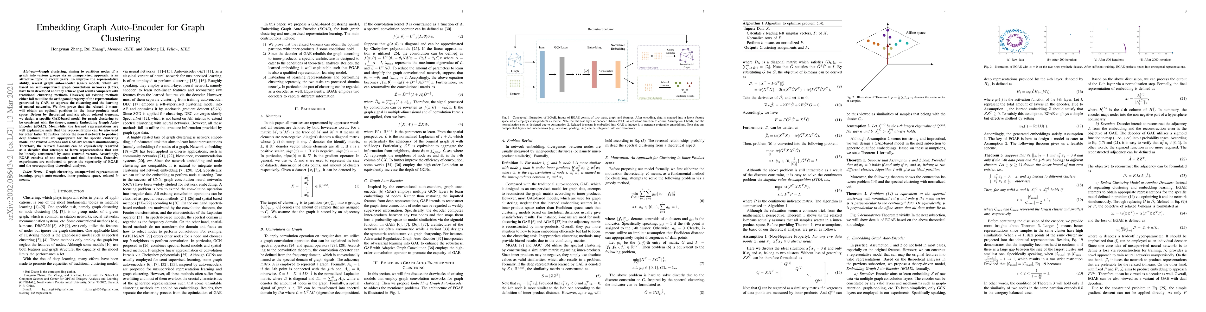 The paper proposes an Embedding Graph Auto-Encoder (EGAE) model for graph clustering, which integrates relaxed k-means with graph auto-encoders to leverage the orthogonal property of representations and optimize both clustering and neural network learning simultaneously. Experimental results show EGAE's superior performance over traditional methods.