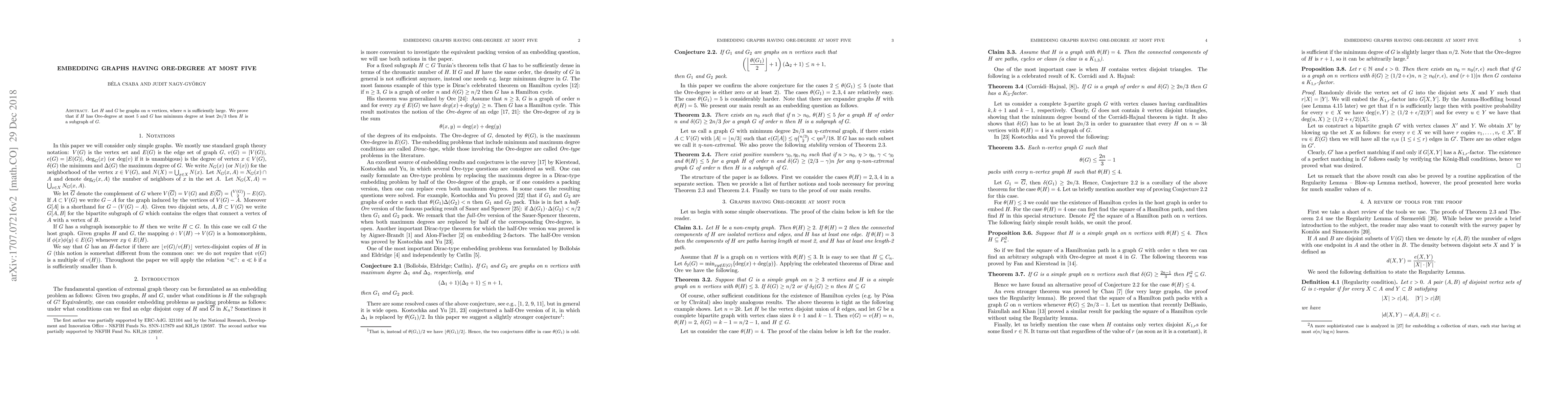 Researchers prove that if a graph H has Ore-degree at most 5 and another graph G has minimum degree of at least 2n/3, then H is a subset of G for sufficiently large n.