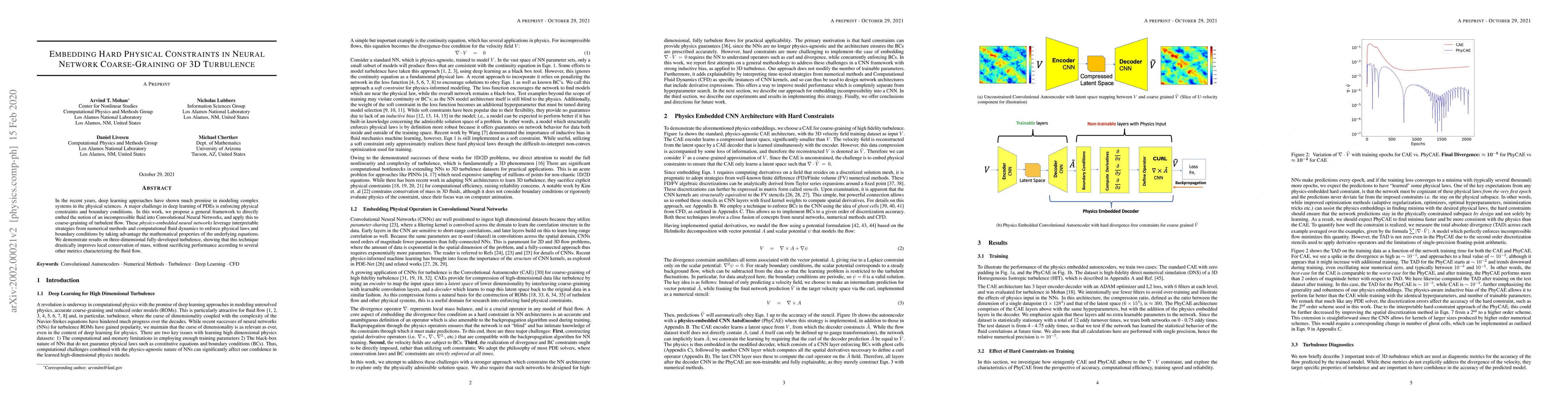 This paper presents a framework for embedding incompressible fluid constraints directly into Convolutional Neural Networks to enhance the coarse-graining of turbulent flow. The approach leverages numerical methods and computational fluid dynamics to enforce physical laws, leading to improved mass conservation in 3D turbulence simulations without compromising performance.