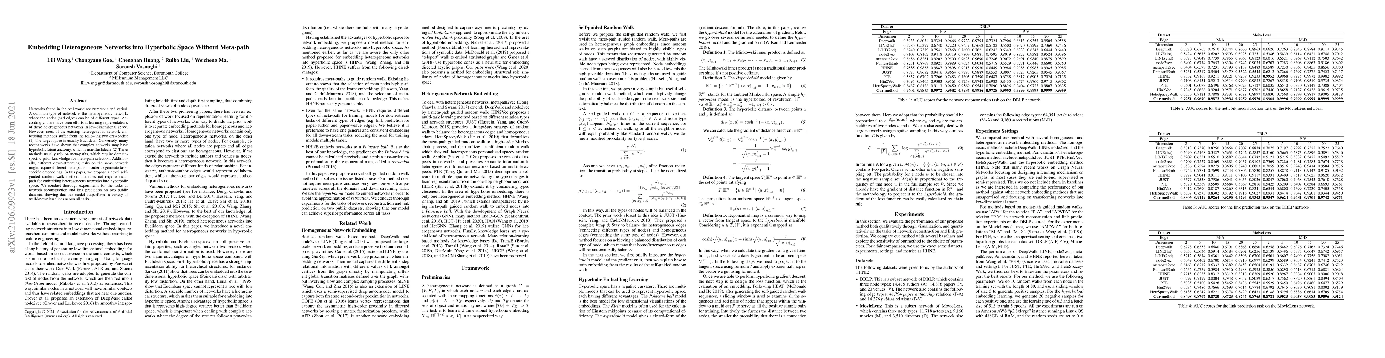 This paper proposes a novel self-guided random walk method to embed heterogeneous networks into hyperbolic space without relying on meta-paths, addressing the limitations of existing methods that use Euclidean spaces and require domain-specific meta-path information. Experimental results on network reconstruction and link prediction show superior performance compared to baselines.