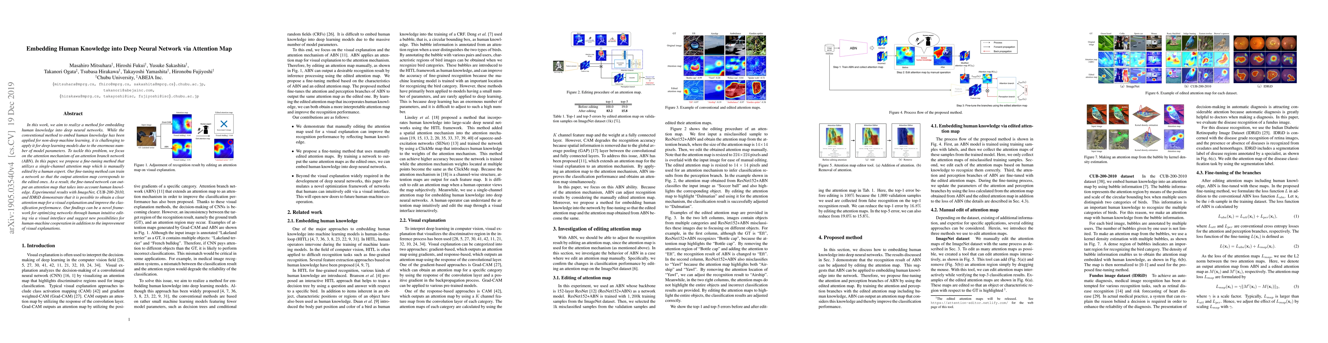 This paper proposes a fine-tuning method using an attention branch network to embed human knowledge into deep neural networks via manually edited attention maps. Experimental results show improved classification performance and clear visual explanations, suggesting a new framework for human-machine cooperation.
