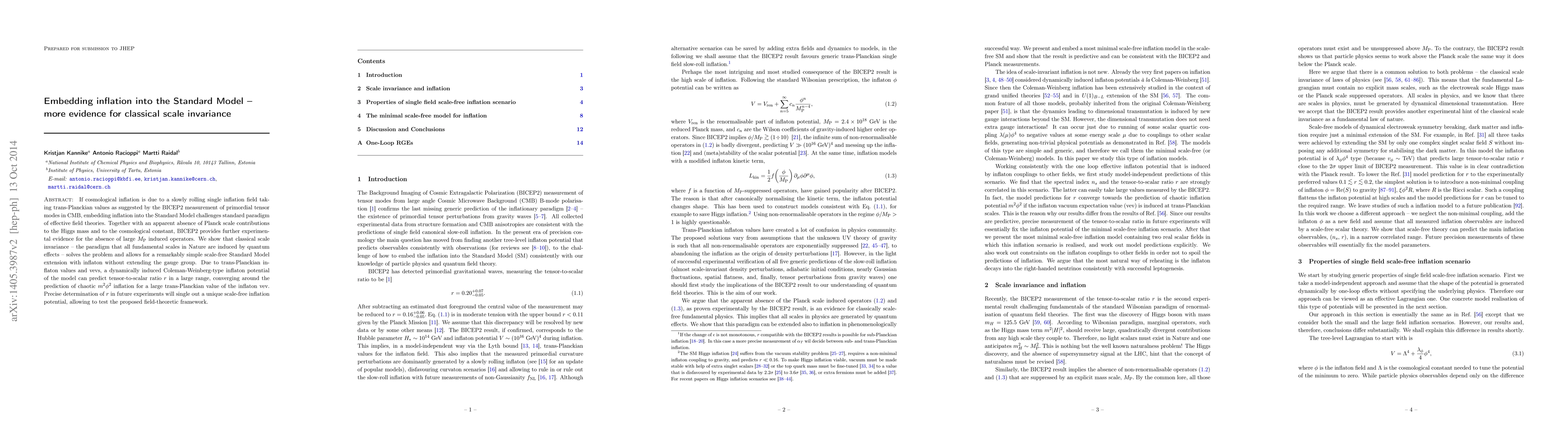 If cosmological inflation is due to a slowly rolling single inflation field taking trans-Planckian values as suggested by the BICEP2 measurement of primordial tensor modes in CMB, embedding inflation into the Standard Model challenges standard paradigm of effective field theories. Together with an apparent absence of Planck scale contributions to the Higgs mass and to the cosmological constant, BICEP2 provides further experimental evidence for the absence of large $M_{\rm P}$ induced operators. We show that classical scale invariance, the paradigm that all fundamental scales in Nature are induced by quantum effects, solves the problem and allows for a remarkably simple scale-free Standard Model extension with inflaton without extending the gauge group. Due to trans-Planckian inflaton values and vevs, a dynamically induced Coleman-Weinberg-type inflaton potential of the model can predict tensor-to-scalar ratio $r$ in a large range, converging around the prediction of chaotic $m^2\phi^2$ inflation for a large trans-Planckian value of the inflaton vev. Precise determination of $r$ in future experiments will single out a unique scale-free inflation potential, allowing to test the proposed field-theoretic framework.