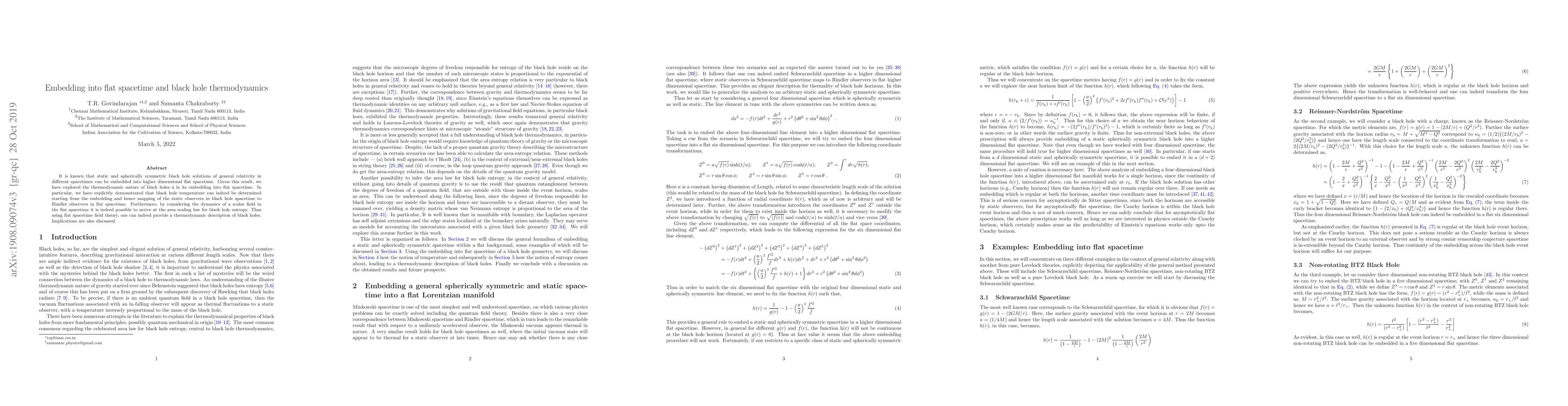 This paper explores the thermodynamic nature of black holes by embedding static, spherically symmetric black hole solutions into higher-dimensional flat spacetime. It demonstrates that black hole temperature can be derived from this embedding, and uses flat spacetime field theory to establish the area scaling law for black hole entropy, providing a thermodynamic description of black holes.