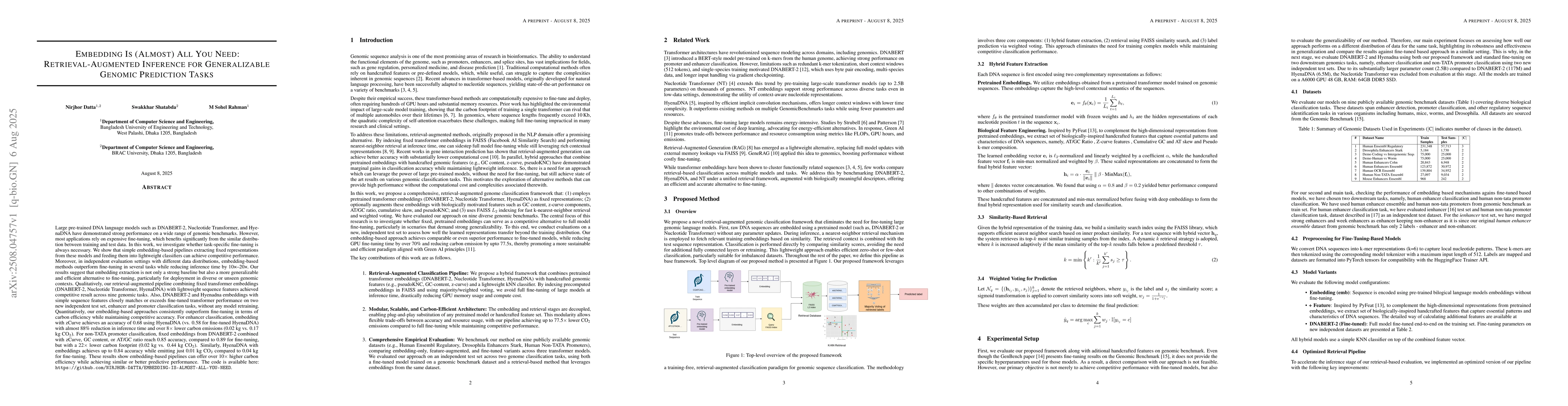 Large pre-trained DNA language models such as DNABERT-2, Nucleotide Transformer, and HyenaDNA have demonstrated strong performance on various genomic benchmarks. However, most applications rely on expensive fine-tuning, which works best when the training and test data share a similar distribution. In this work, we investigate whether task-specific fine-tuning is always necessary. We show that simple embedding-based pipelines that extract fixed representations from these models and feed them into lightweight classifiers can achieve competitive performance. In evaluation settings with different data distributions, embedding-based methods often outperform fine-tuning while reducing inference time by 10x to 20x. Our results suggest that embedding extraction is not only a strong baseline but also a more generalizable and efficient alternative to fine-tuning, especially for deployment in diverse or unseen genomic contexts. For example, in enhancer classification, HyenaDNA embeddings combined with zCurve achieve 0.68 accuracy (vs. 0.58 for fine-tuning), with an 88% reduction in inference time and over 8x lower carbon emissions (0.02 kg vs. 0.17 kg CO2). In non-TATA promoter classification, DNABERT-2 embeddings with zCurve or GC content reach 0.85 accuracy (vs. 0.89 with fine-tuning) with a 22x lower carbon footprint (0.02 kg vs. 0.44 kg CO2). These results show that embedding-based pipelines offer over 10x better carbon efficiency while maintaining strong predictive performance. The code is available here: https://github.com/NIRJHOR-DATTA/EMBEDDING-IS-ALMOST-ALL-YOU-NEED.