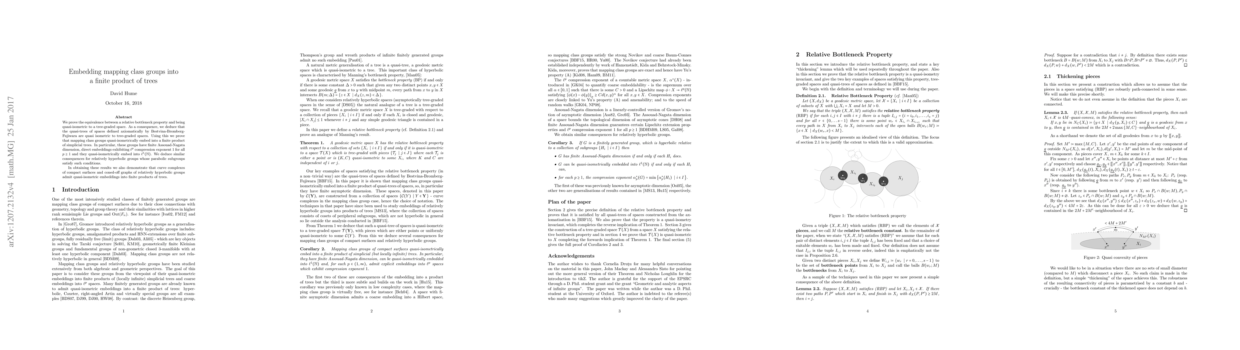 This paper establishes an equivalence linking a relative bottleneck property with quasi-isometry to tree-graded spaces, leading to the conclusion that Bestvina-Bromberg-Fujiwara's quasi-trees are quasi-isometric to tree-graded spaces. It demonstrates that mapping class groups can be quasi-isometrically embedded into finite products of simplicial trees, resulting in finite Assouad-Nagata dimension and $\ell^p$ compression exponent 1 for all $p \geq 1$.