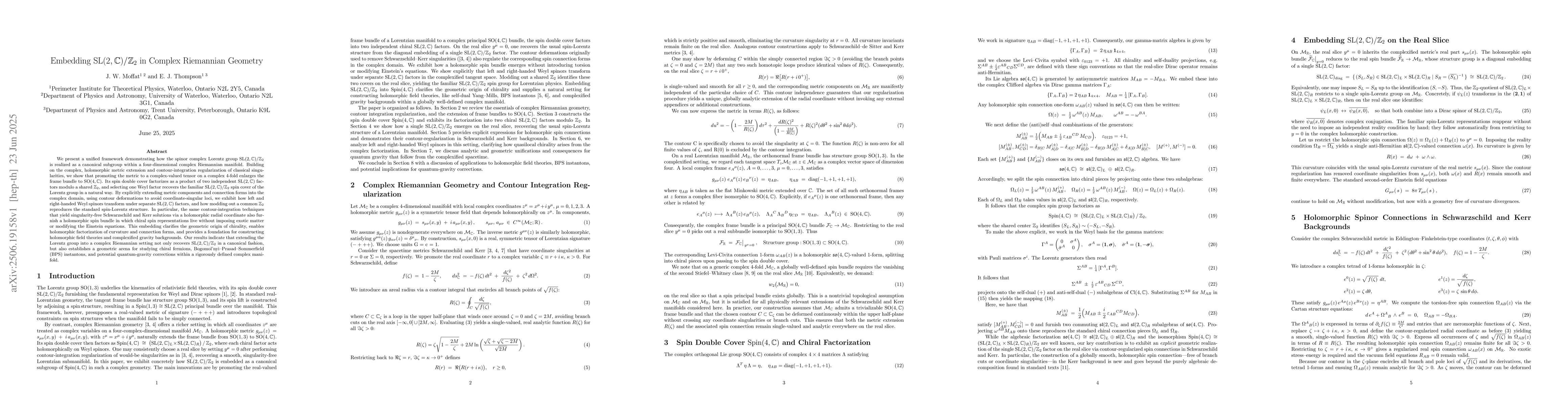 We present a unified framework demonstrating how the spinor complex Lorentz group SL(2,C)/Z\_2 is realized as a canonical subgroup within a four-dimensional complex Riemannian manifold. Building on the complex, holomorphic metric extension and contour-integration regularization of classical singularities, we show that promoting the metric to a complex-valued tensor on a complex 4-fold enlarges the frame bundle to SO(4,C). Its spin double cover factorizes as a product of two independent SL(2,C) factors modulo a shared Z\_2, and selecting one Weyl factor recovers the familiar SL(2,C)/Z\_2 spin cover of the Lorentz group. By explicitly extending metric components and connection forms into the complex domain, using contour deformations to avoid coordinate-singular loci, we exhibit how left- and right-handed Weyl spinors transform under separate SL(2,C) factors, and how modding out a common Z\_2 reproduces the standard spin-Lorentz structure. In particular, the same contour-integration techniques that yield singularity-free Schwarzschild and Kerr solutions via a holomorphic radial coordinate also furnish a holomorphic spin bundle in which chiral spin representations live without imposing exotic matter or modifying the Einstein equations. This embedding clarifies the geometric origin of chirality, enables holomorphic factorization of curvature and connection forms, and provides a foundation for constructing holomorphic field theories and complexified gravity backgrounds. Our results indicate that extending the Lorentz group into a complex Riemannian setting not only recovers SL(2,C)/Z\_2 in a canonical fashion, but also establishes a geometric arena for studying chiral fermions, Bogomol'nyi-Prasad-Sommerfield (BPS) instantons, and potential quantum-gravity corrections within a rigorously defined complex manifold.